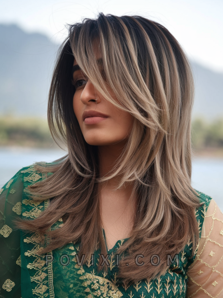The Indian-inspired shag features cascading layers with a soft, natural finish that enhances thick hair textures. This style is perfect for weddings, festive occasions, or cultural events. It complements square or heart-shaped faces and highlights warm-toned skin and dark eyes.