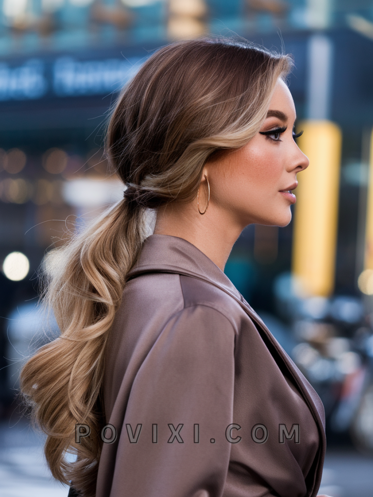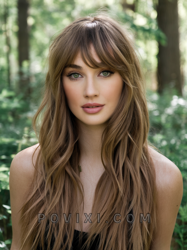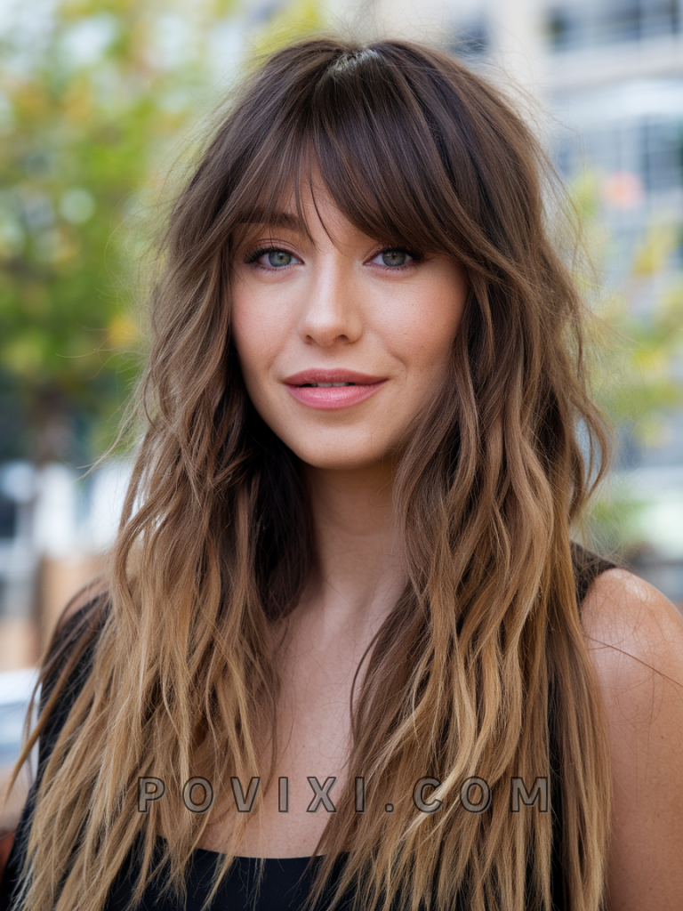 Pairing natural waves with curtain bangs creates a carefree and romantic style. This look is perfect for beach days, casual weekends, or even an intimate wedding. The curtain bangs frame the face softly, making it ideal for round or heart-shaped faces, and complement hazel or green eyes beautifully.