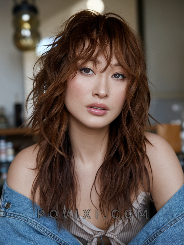 A Korean-inspired shag with curtain bangs combines trendy and timeless elements. This style frames the face delicately, making it ideal for casual outings or date nights. It works well with oblong and diamond-shaped faces, highlighting cheekbones and jawlines.