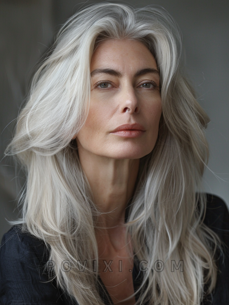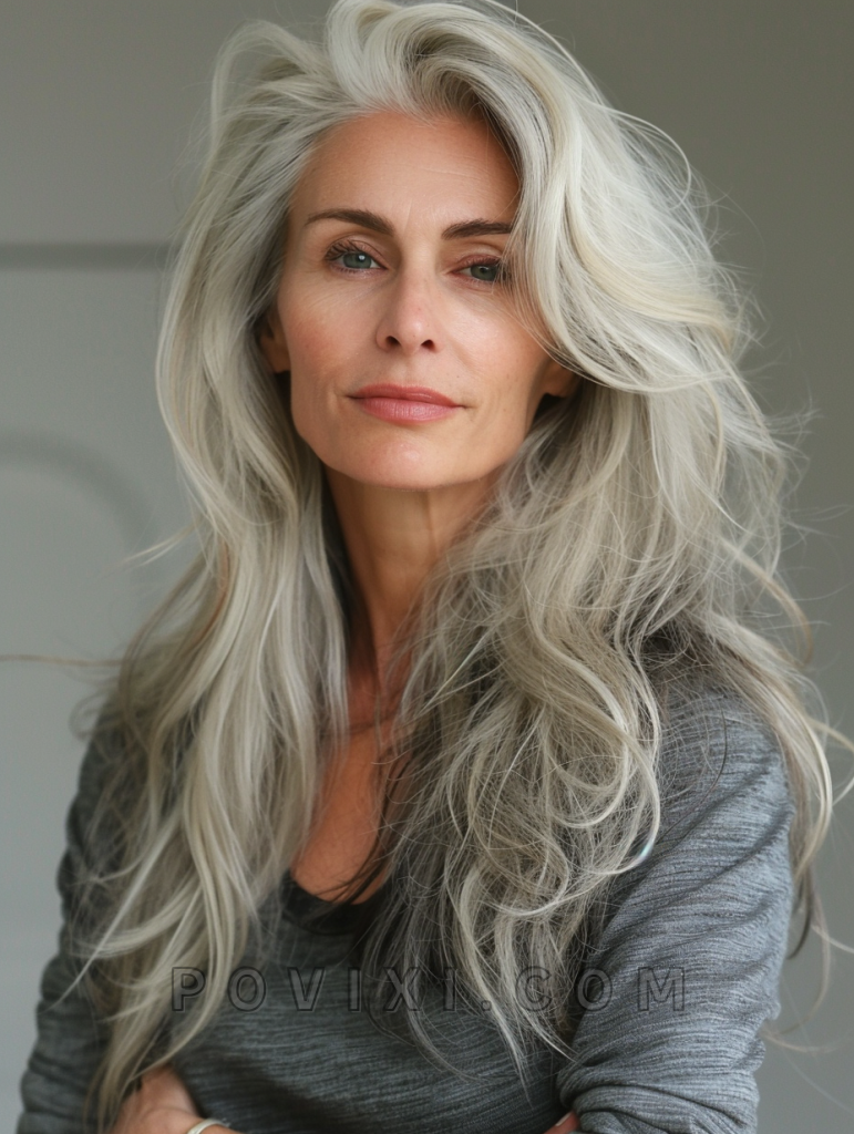 The shag with platinum highlights is a striking and modern hairstyle that adds a pop of brightness to your look. This style features long, layered hair with bold platinum highlights that create a stunning contrast. It’s perfect for older women with fine hair or thinning hair, as the highlights add depth and dimension. This hairstyle suits oval and heart-shaped faces best, and highlights natural hair color beautifully. It’s a great choice for both casual and formal events.