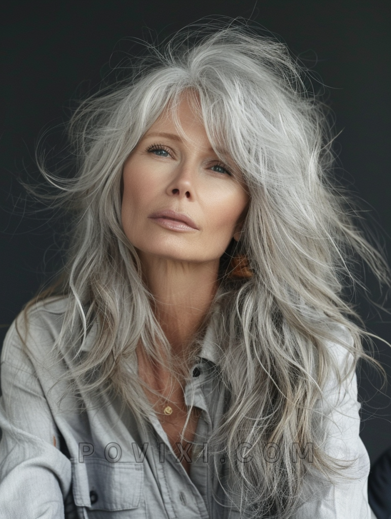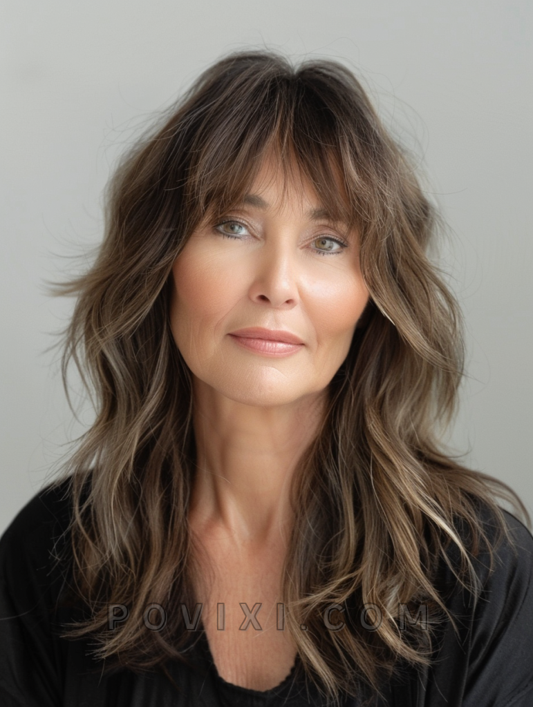 The shag with textured bangs is a trendy and stylish choice that adds a modern twist to the classic shag. This style features long, layered hair with textured bangs that create a dynamic and edgy look. It’s perfect for older women with fine hair or thinning hair, as the textured bangs add volume and interest. This hairstyle suits almost any face shape and highlights natural hair color beautifully. It’s ideal for both everyday wear and special occasions.