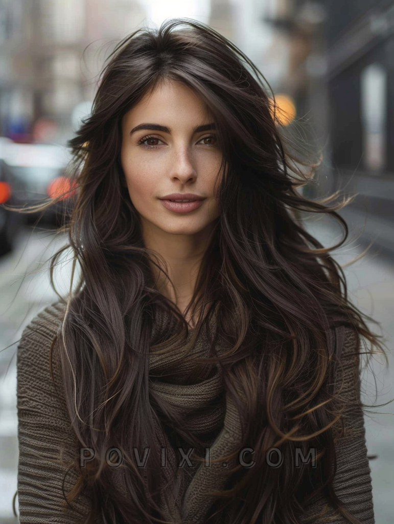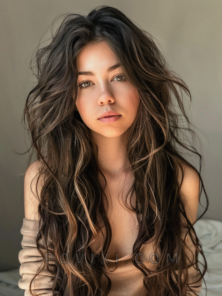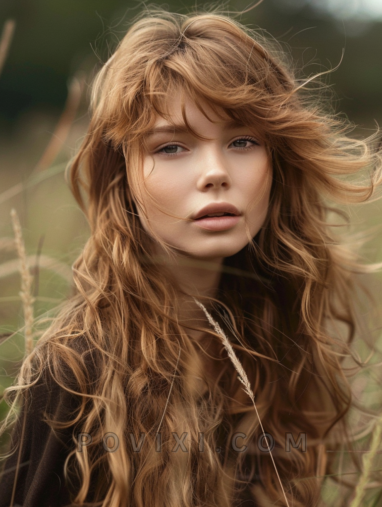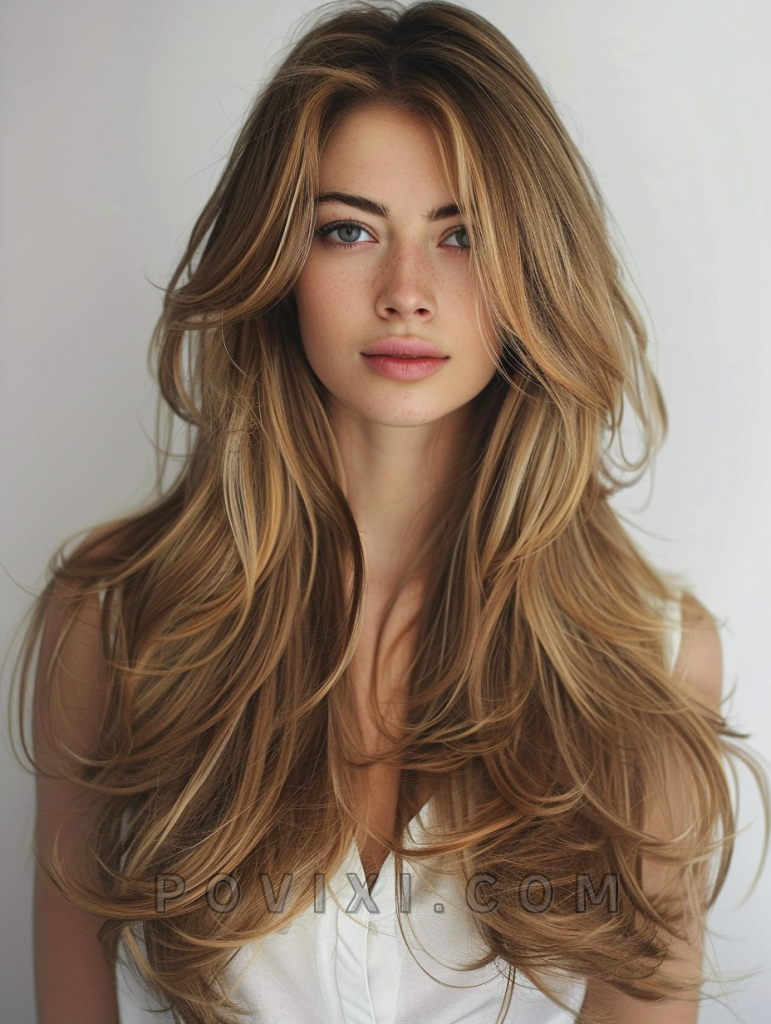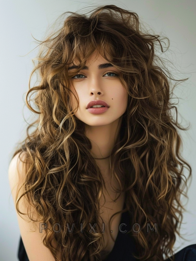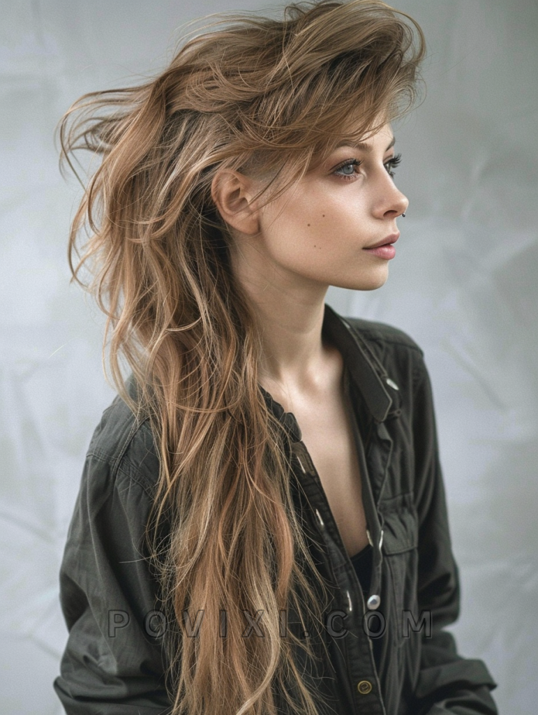 The shag with honey highlights is a sweet and subtle hairstyle that adds a touch of warmth to your look. This style features long, layered hair with honey-colored highlights that create depth and dimension. It’s perfect for those with straight hair or curly hair, as the highlights add brightness and movement. This hairstyle suits oval and round face shapes best, enhancing eye colors like brown and hazel beautifully. It’s ideal for both casual and formal events.