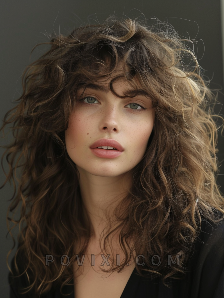 The long shag for curly hair is a fabulous choice that embraces natural curls and adds shape and structure to the hair. This style features layered curls that create a voluminous, bouncy look perfect for women with naturally curly hair. It suits round and heart-shaped faces, bringing attention to the eyes and cheekbones. This hairstyle is ideal for both casual and formal settings, showcasing your curls beautifully.