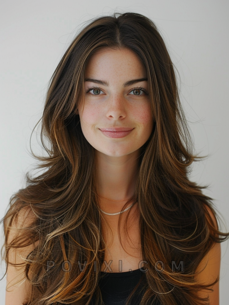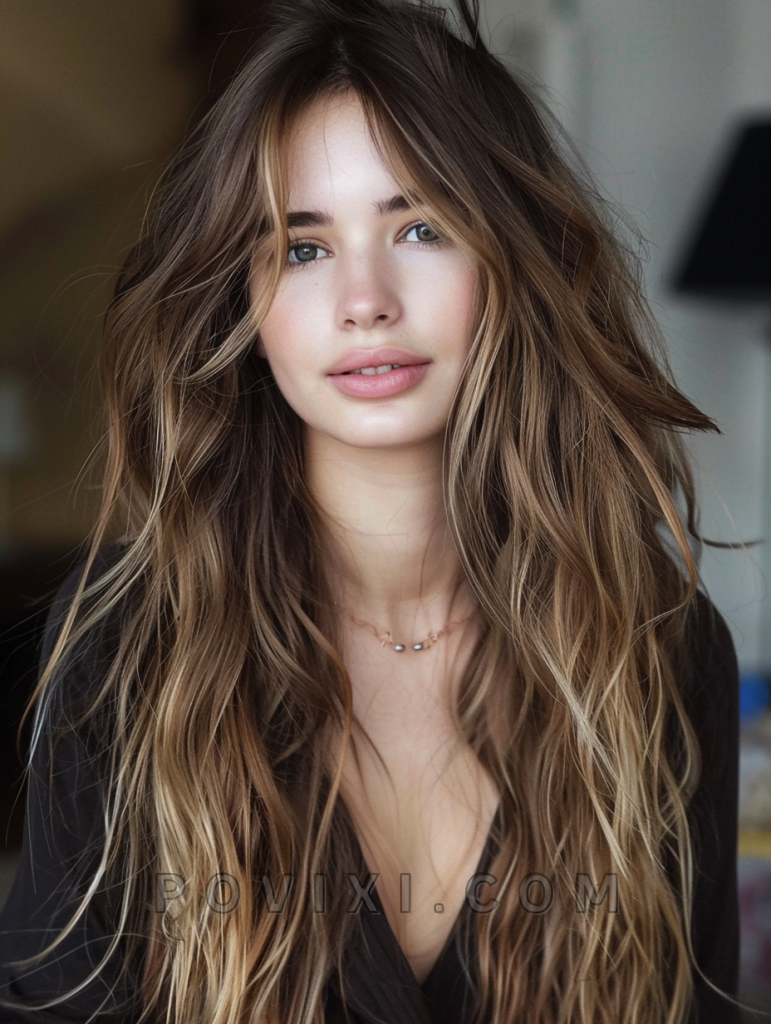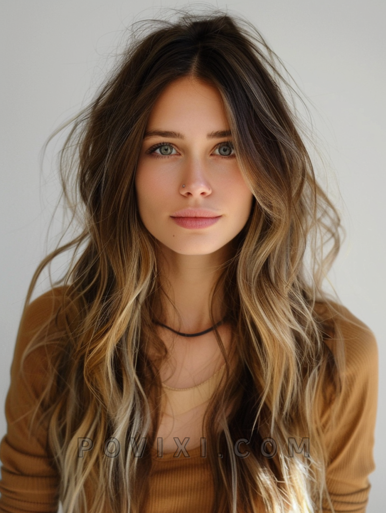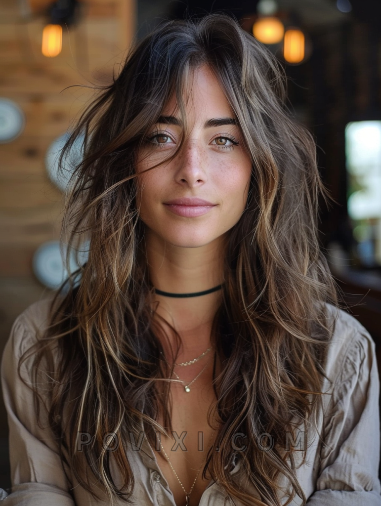 The shag with sunkissed highlights is a sunlit and vibrant hairstyle that adds a natural glow to your look. This style features long, layered hair with subtle, sunkissed highlights that create a radiant, beachy vibe. It’s perfect for those with straight hair or curly hair, as the highlights add brightness and movement. This hairstyle suits oval and heart-shaped faces best, enhancing eye colors like blue and green beautifully. It’s ideal for both casual and formal events.