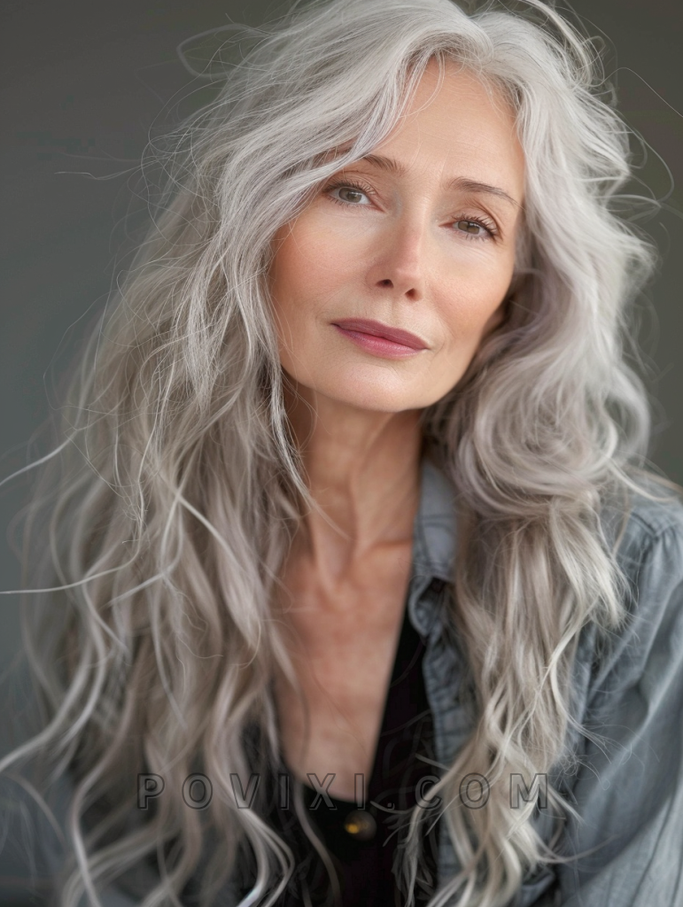 The shag with soft waves is a romantic and feminine style that adds a touch of elegance to your look. This hairstyle features long, layered hair styled into soft, loose waves. It’s perfect for older women over 60 with curly hair or straight hair, as the waves add volume and movement. This style suits oval and heart-shaped faces best, highlighting eye colors like blue and green beautifully. It’s a great choice for weddings, parties, or any formal event.
