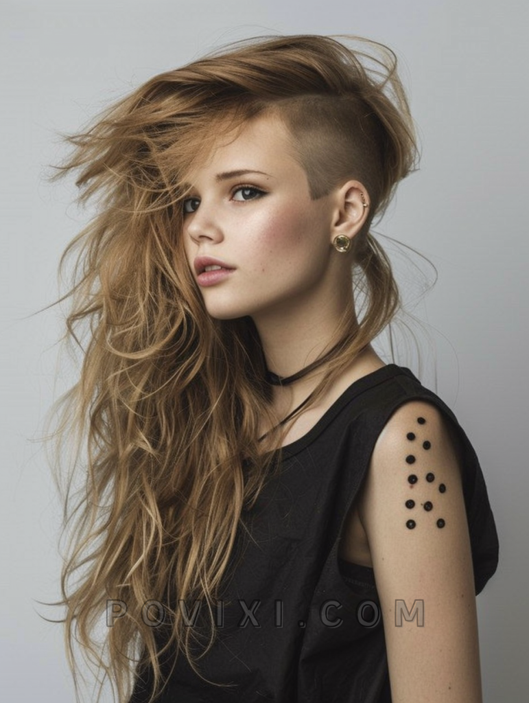 The shag with undercut is a bold and modern choice that adds an edgy element to your look. This style features long, layered hair on top with a shaved or closely cropped undercut on the sides and back. It’s perfect for those with fine hair or thinning hair, as the undercut creates a striking contrast and adds volume to the top. This hairstyle suits almost any face shape and highlights your unique style. It’s ideal for those who love to make a statement with their hair.