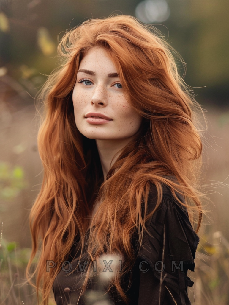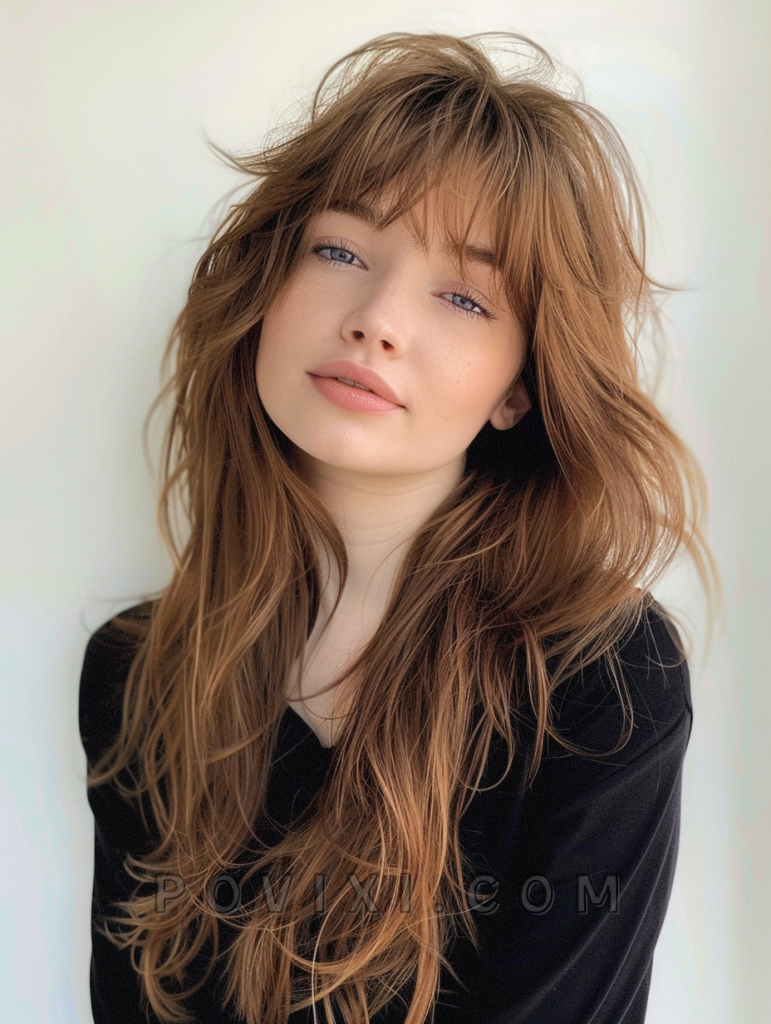 The shag with copper tones is a bold and vibrant hairstyle that adds a touch of warmth to your look. This style features long, layered hair with rich copper highlights that create depth and dimension. This hairstyle suits oval and round face shapes best, enhancing eye colors like brown and green beautifully. It’s ideal for both casual and formal events.