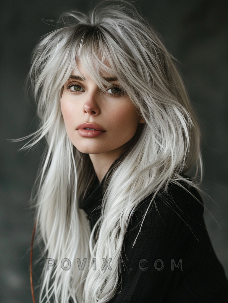 The shag with shadow root is a stylish and low-maintenance hairstyle that adds depth and dimension to your look. This style features long, layered hair with a darker root that gradually lightens towards the ends. It’s perfect for those with straight hair or curly hair, as the shadow root creates a seamless, natural transition. This hairstyle suits oval and heart-shaped faces best, emphasizing eye colors like brown and green beautifully. It’s ideal for both casual and formal settings.