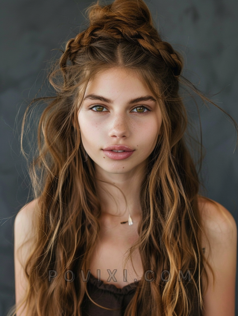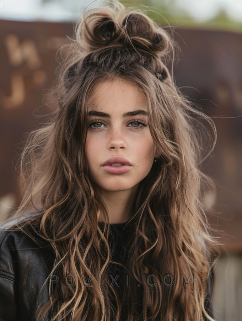 The shag with a braided top knot is a playful and creative hairstyle that adds a touch of whimsy to your look. This style features long, layered hair with a top knot braid that adds texture and interest. This hairstyle suits almost any face shape and highlights natural hair color beautifully. It’s ideal for festivals, parties, or any special occasion.