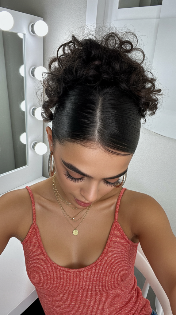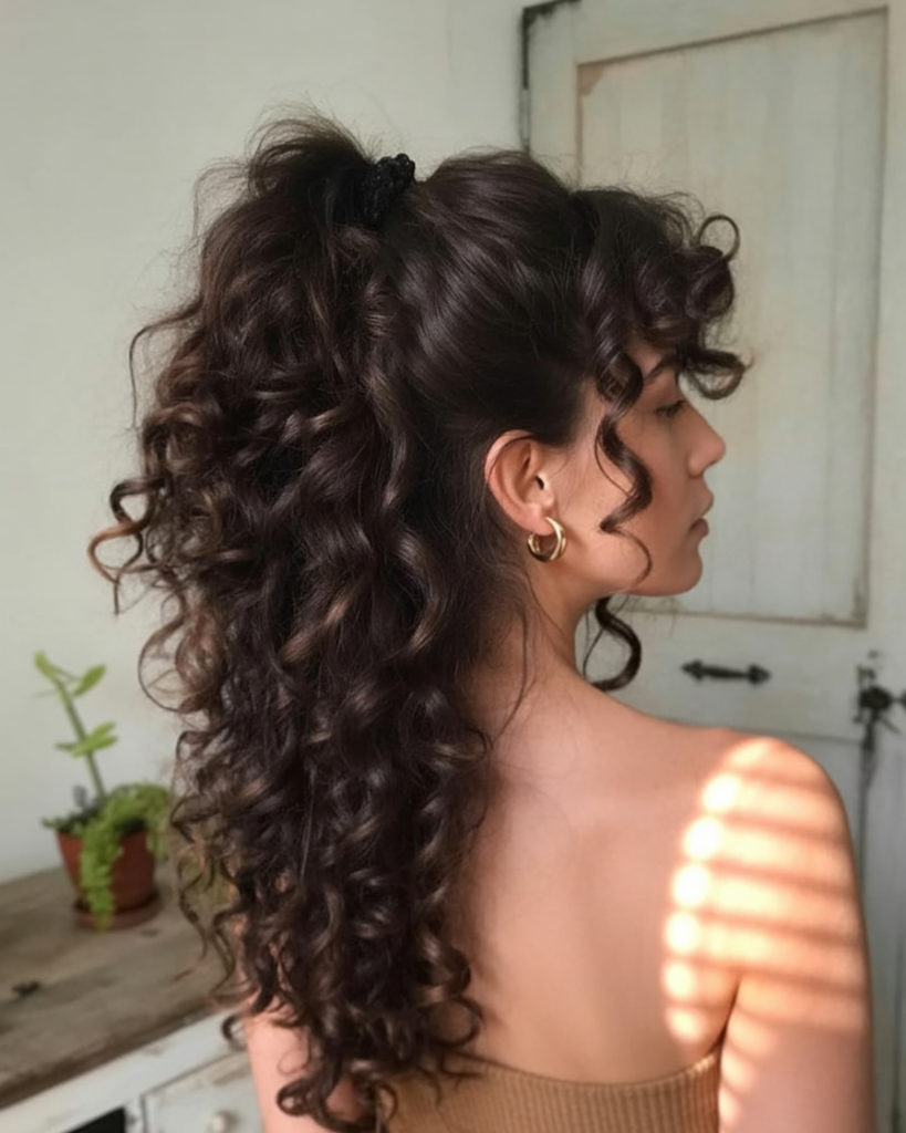 The style is ideal in long-haired women who have curly hair and desire to exhibit volume without a full updo. Would tremendously suit oval or longer face shapes, as it adds proportion to the style. Add an attitude to it by using gold hoops or big earrings. It conveys more than a mere hairdo; it emits a new air of self-confidence- reaffirming to you that haircuts can speak as much as a favorite outfit.