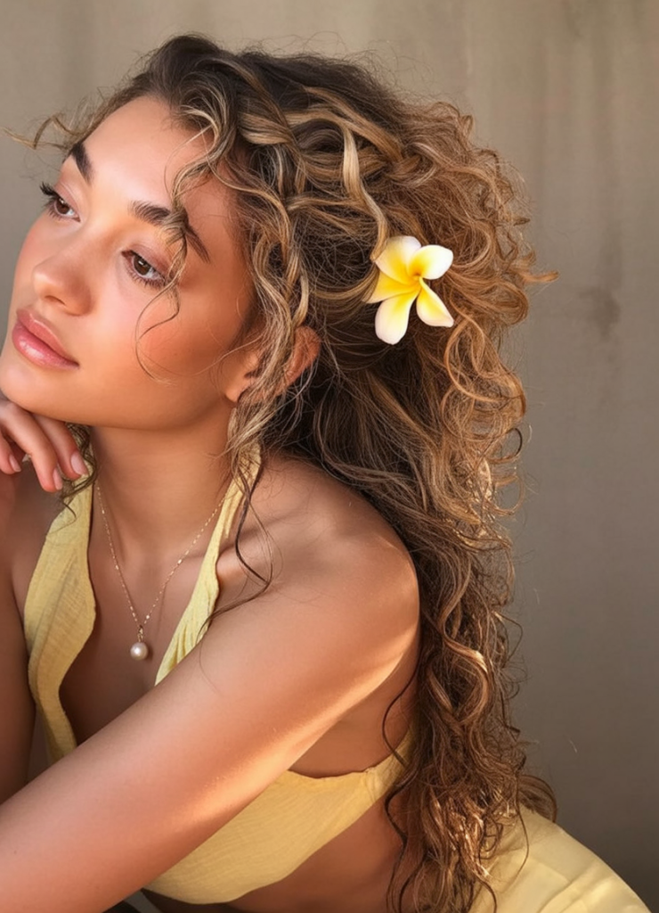 Exuding tropical beauty, this hairstyle has sun-kissed curls and the freshness of a flower resting beside it. It radiates an easy breezy feel of spending time off. It is casual yet classy. Curly locks flow naturally, which along with the addition of a flower detail makes it as a breeze of summer.
