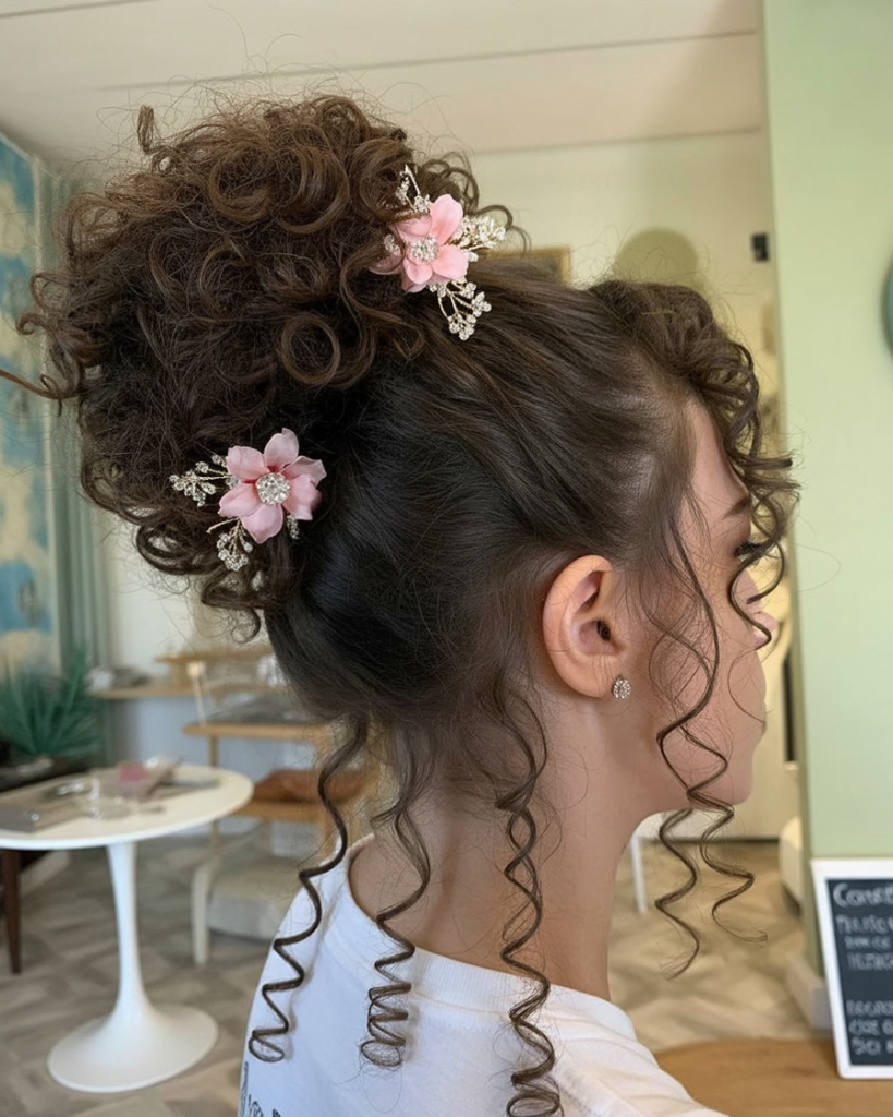 The style is romantic and feminine as the curls are pulled on top of her, softened with flower hairpins. The falling curly locks framing the face also lend some charm and the flowers make the appearance all the more feminine and festive. It is the sort of hairdo that can make you instantly feel as though you are at a special occasion, even on a regular day.