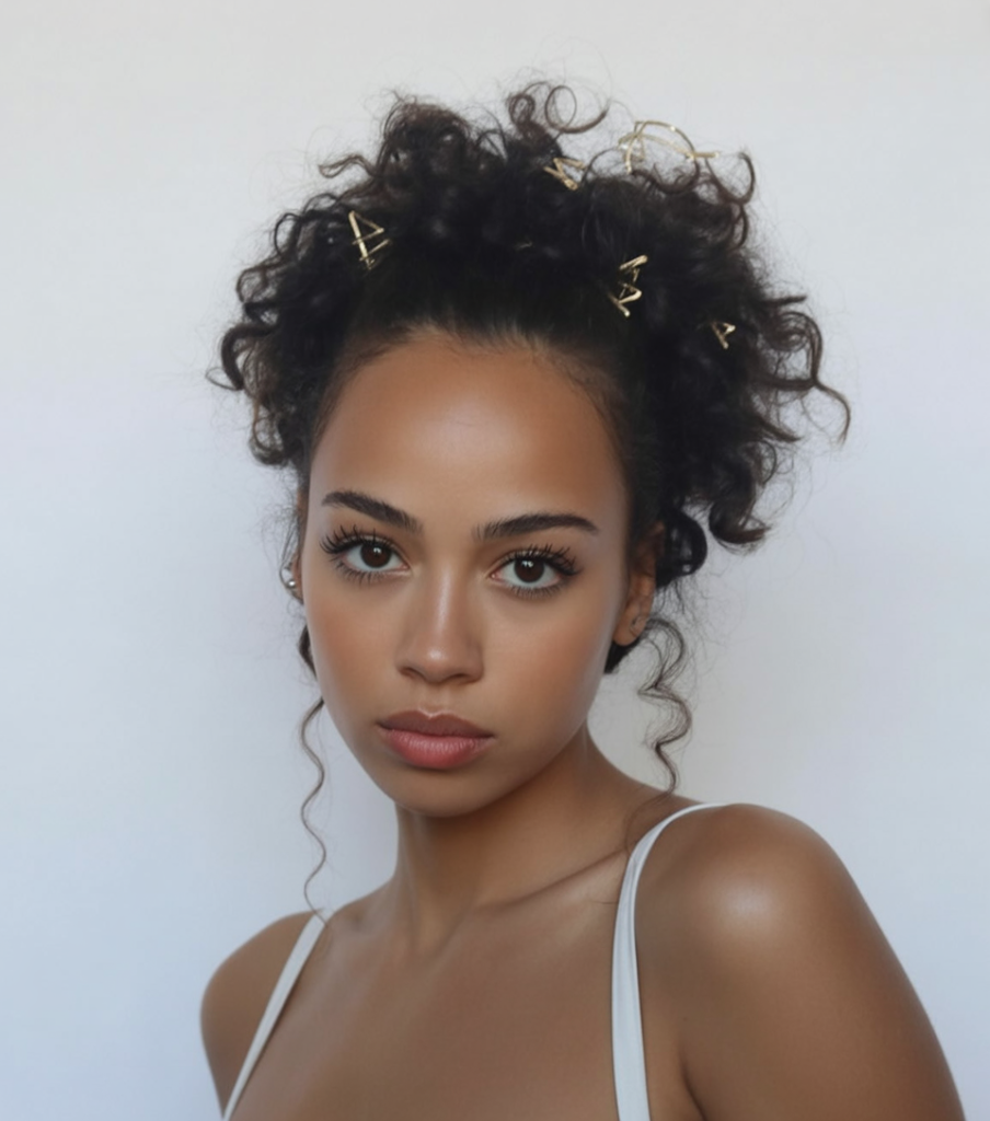 Protective styles without losing personality would fit this hairstyle well because it is a great fit with medium to tight curl patterns in women. In addition to being trendy, the pins are practical, as they hold curls instead of creating stabilization and interest. In comparison to braid hairstyles or buns, this one is more of a fun variation that doesn t take that much effort to create, letting the accessories speak instead.