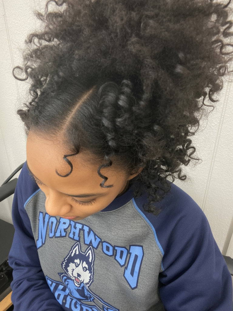This hairstyle is all about volume and texture. The high puff embraces natural curls to their fullest extent with a few well-cultivated curls at front smoothing the appearance and adding character to it. It’s unapologetic, bold, and proudly showcases natural beauty.