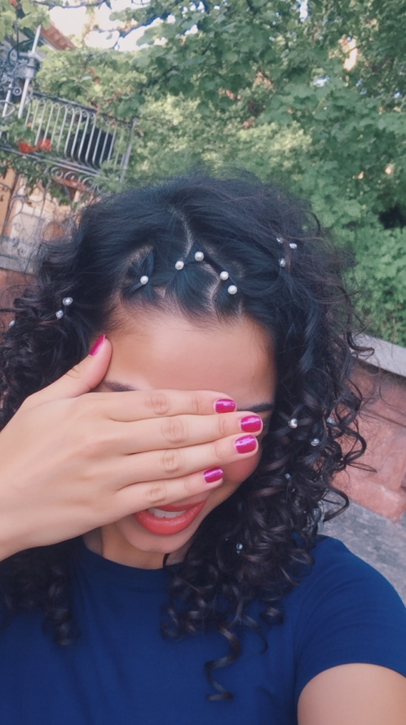 Wearing pearls on curly hair will also give a magical appearance to hair and make it look enchanted. This hairstyle feels whimsical, youthful, and completely unique. The pearls reflect the light, making the look casual to something dazzling without much trouble.