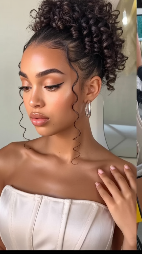 This is the perfect updo that suits women who have curly hair or textured hairstyles, biracial hair. It provides volume on the crown, so it is a flattering style on round and heart-shaped faces. Style: follow a lightweight curl cream to keep the coils shaped and in place by pinning small pieces loosely in the back to create a soft lift. What is special about this look is that it is a balance between both glamour and a soft approachability that is perfect to wear to a special occasion, but not feel like a completely different person.