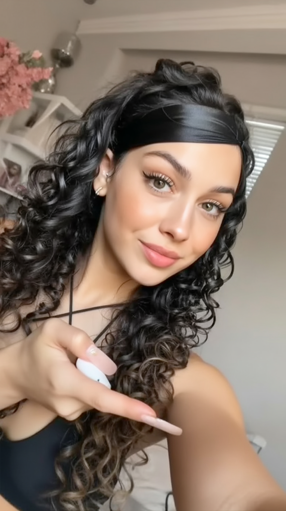 The match of glossy curls and a large headband looks playful, sporty and even a bit retro. This style tends to just keep curls out of the face and to allow them the natural spring that will provide the entire hair style with a fresh, energetic appeal. It is ideal to those women who tend to merge comfort with fashion.