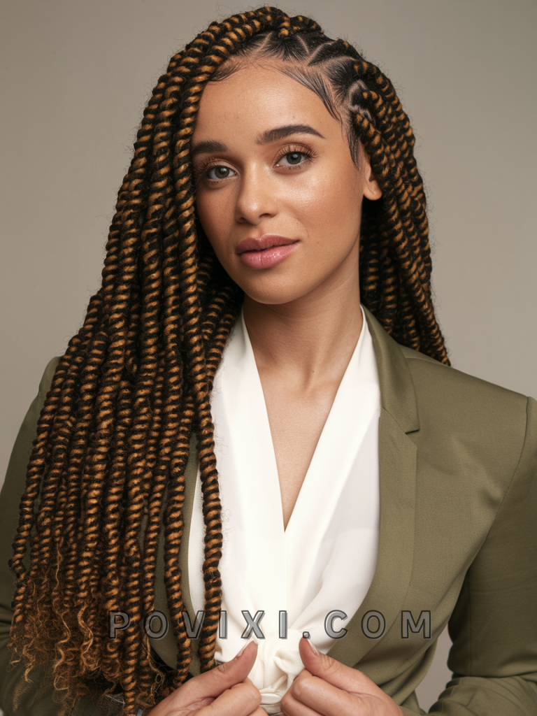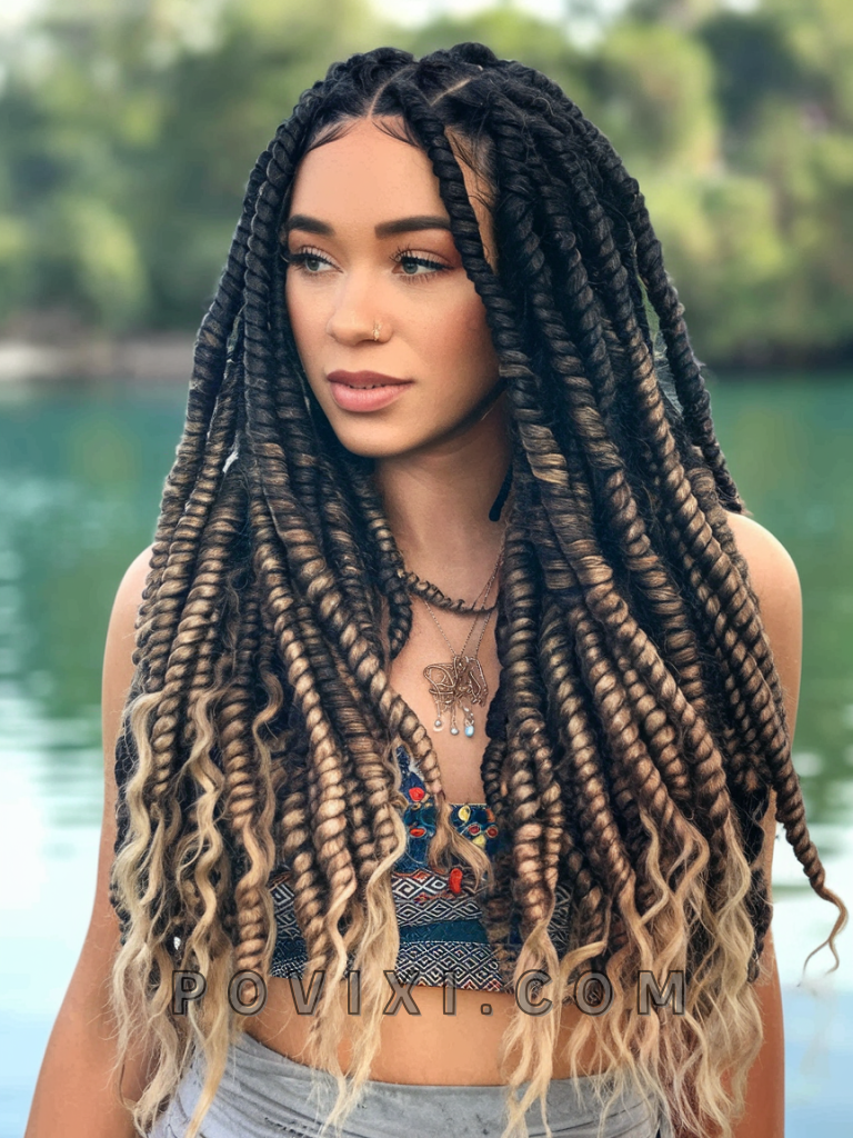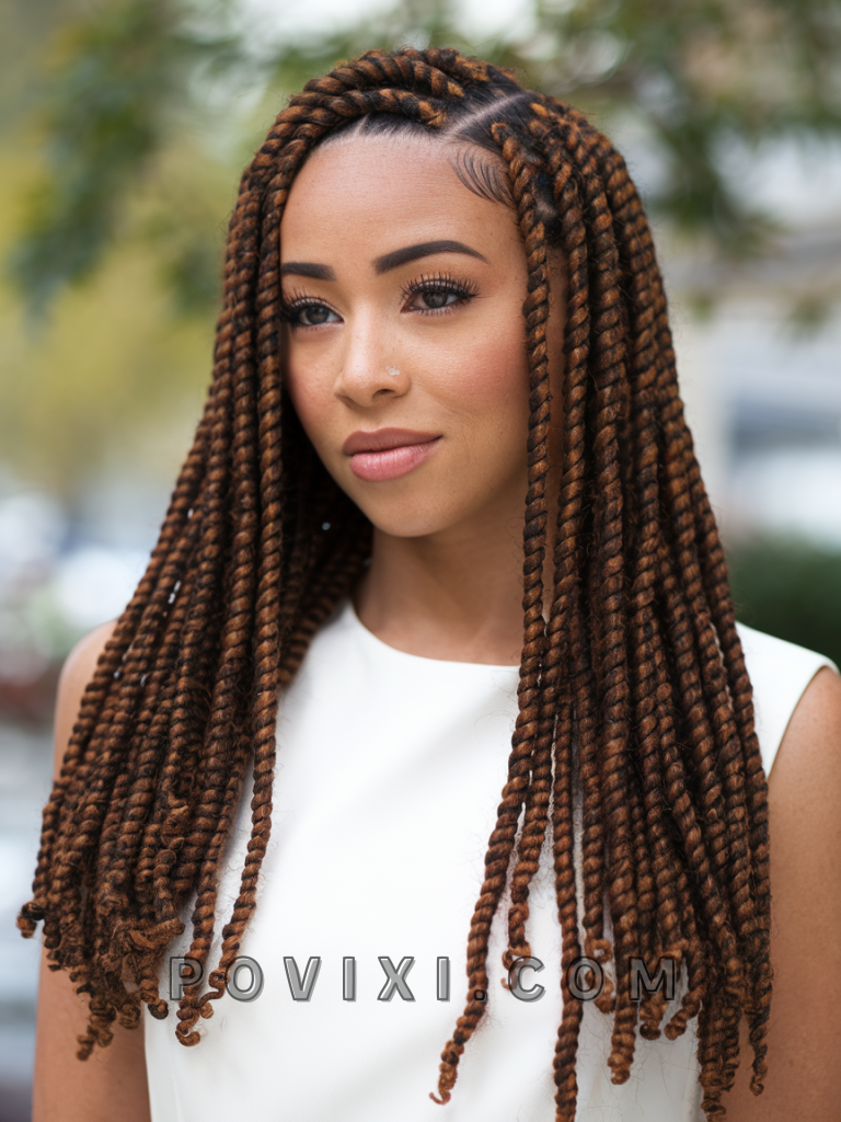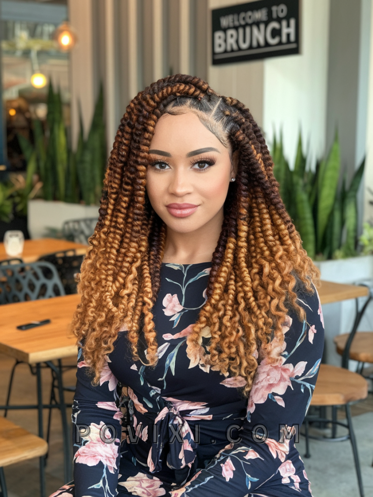 Passion twists with ombre color add a modern and playful twist to the classic style. With gradients transitioning from dark roots to lighter ends, this look is ideal for casual brunches or music festivals. Ombre tones like caramel or icy blonde complement oval and square face shapes, making the hairstyle versatile and striking.