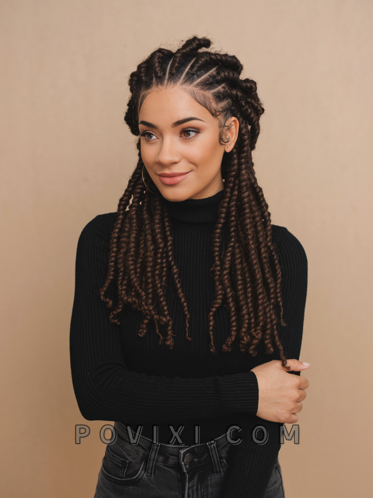 Fulani-inspired passion twists blend traditional African braids with modern twists, creating a unique and meaningful hairstyle. This style features side cornrows leading into twists, offering a stunning combination of textures and patterns. Ideal for oval or heart-shaped faces, it works well with beads or shells for added cultural flair.