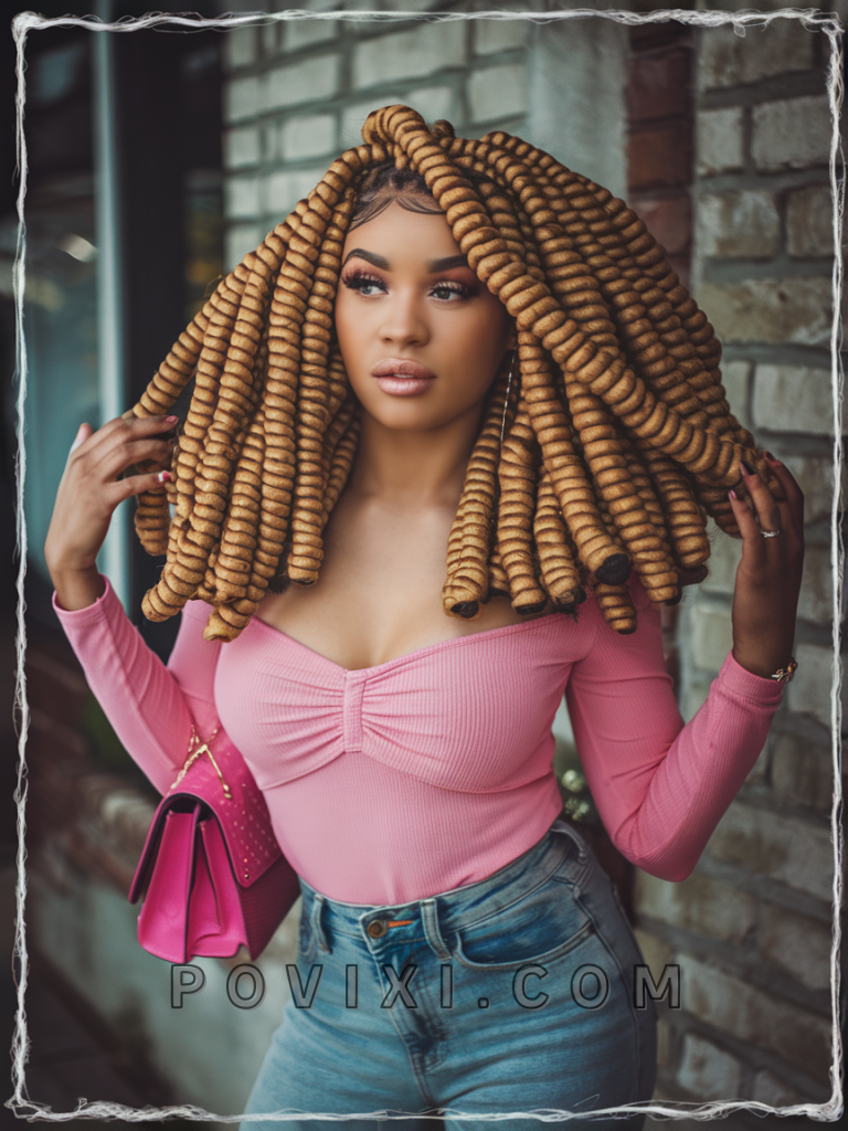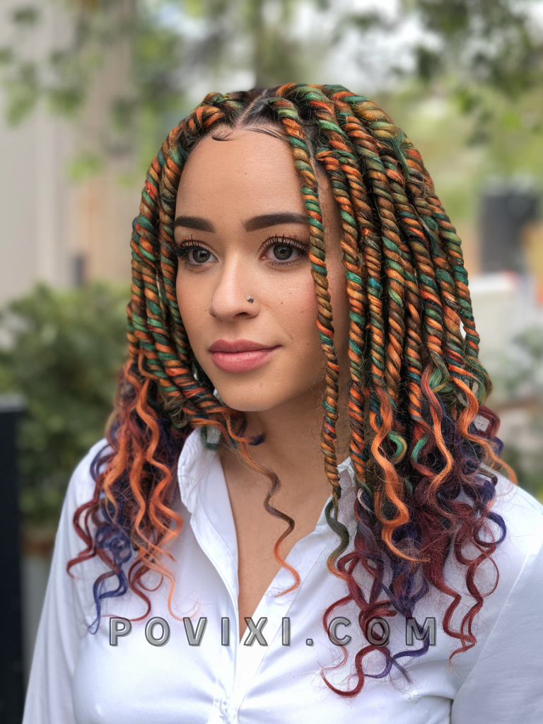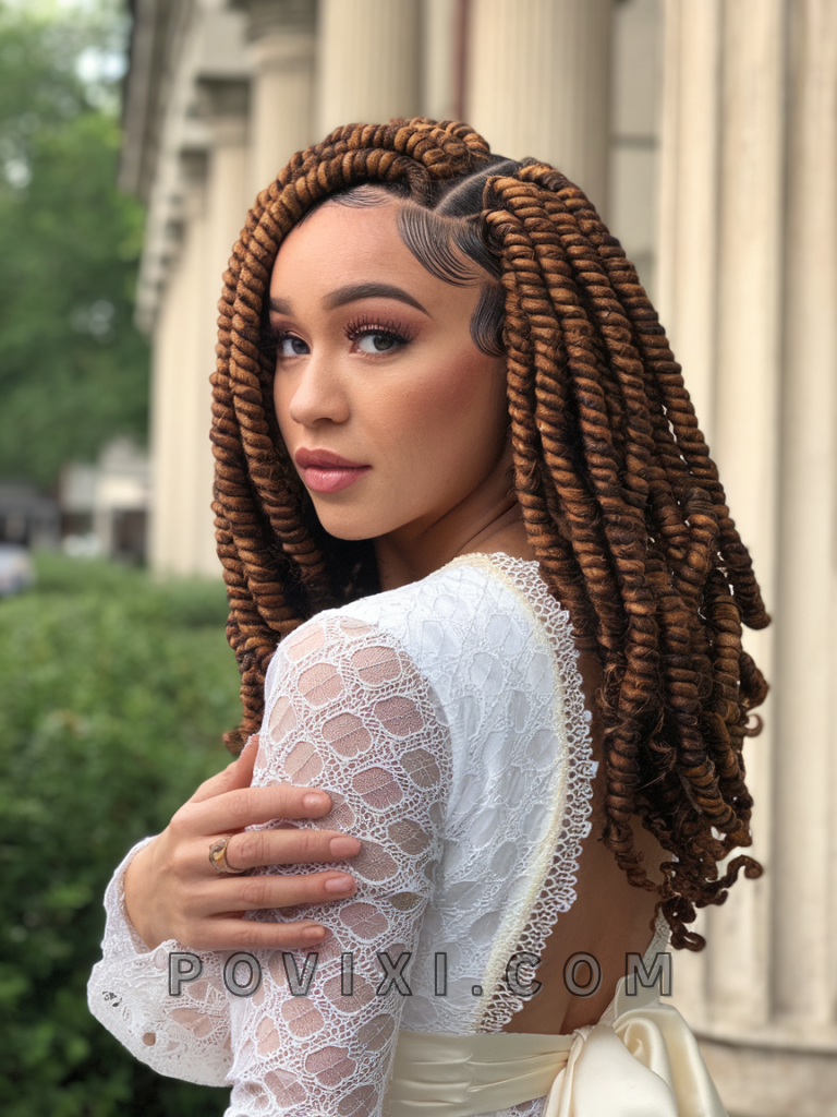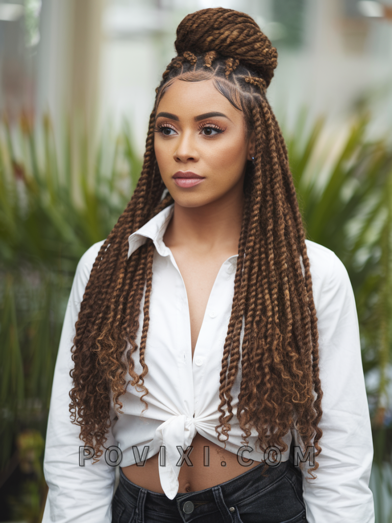 To create this look, use synthetic hair with pre-curled ends for an effortless boho effect. A tutorial on installing these twists might help beginners. Regularly spritz a leave-in conditioner spray to maintain the curls and prevent dryness.