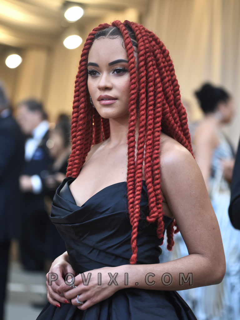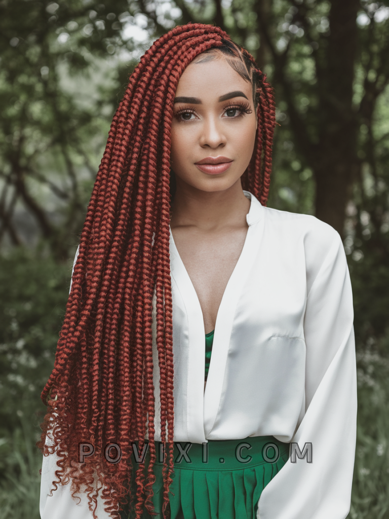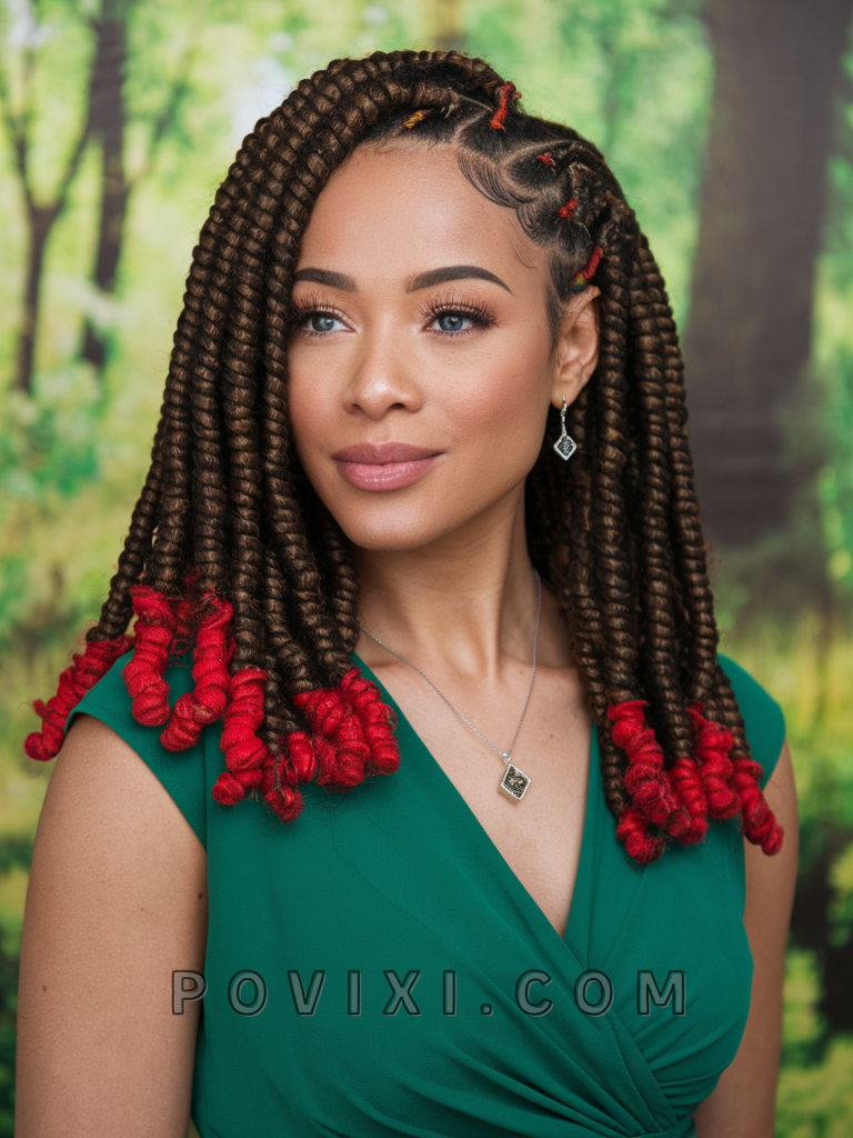 Use pre-colored extensions or dip-dye the ends of your twists for the red effect. Style with a shine-enhancing serum and use a color-protecting shampoo to maintain vibrancy. A satin bonnet at night will keep the twists looking fresh.