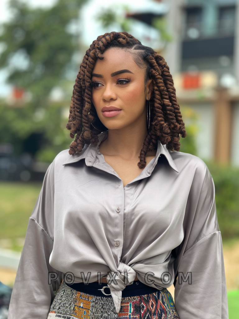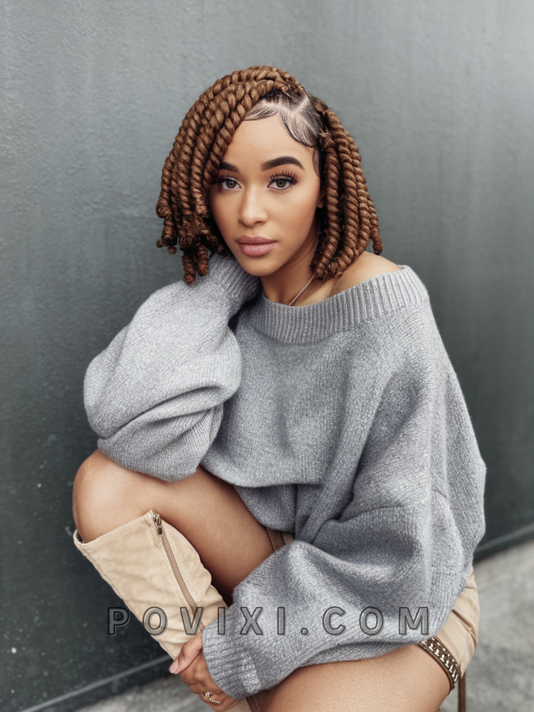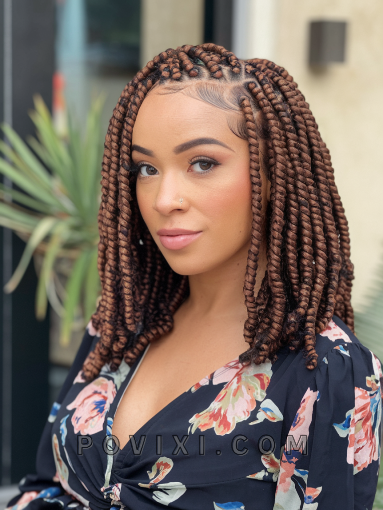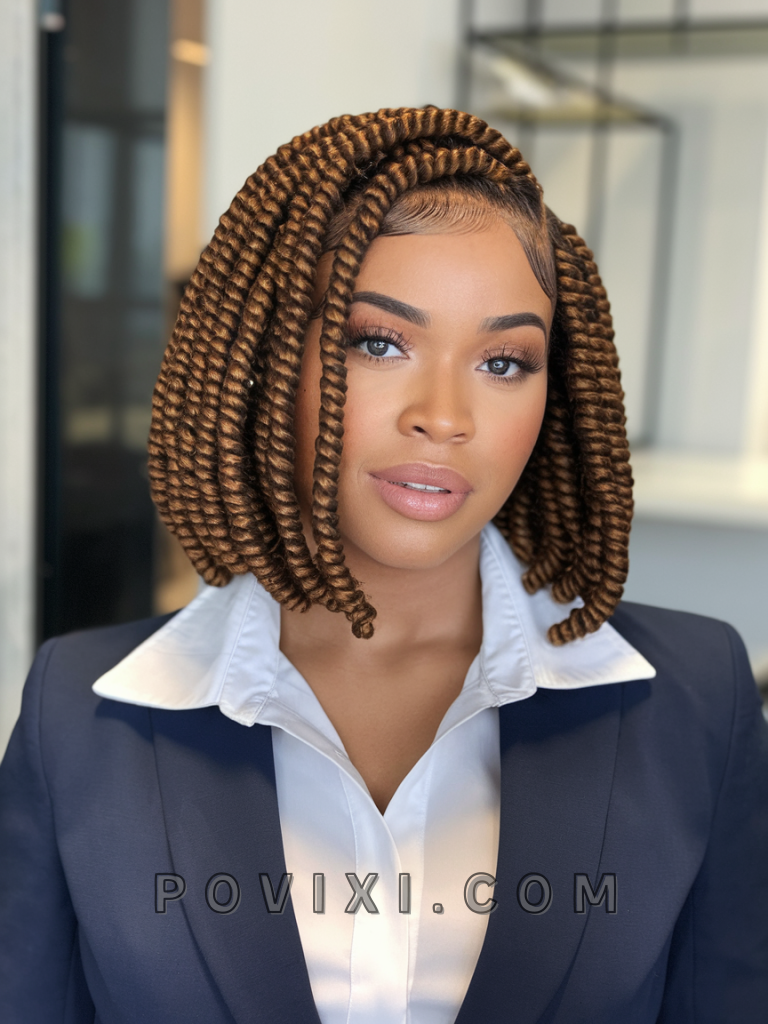 A passion twists bob is a chic, modern take on this timeless style. Falling just below the chin, this short and sassy version is perfect for a professional setting or a trendy night out. Best for diamond or oval face shapes, the bob balances proportions while showcasing strong facial features. Add a touch of color like chestnut brown or red to give it a stylish edge.