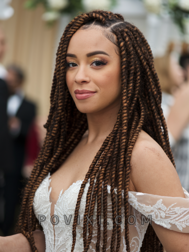 Long passion twists with color create a dramatic and eye-catching effect, perfect for formal occasions or making a statement at a party. These long twists are often paired with bold hues like vibrant reds or soft browns to enhance their visual impact. Best suited for oval or heart-shaped faces, this style flatters a range of natural hair textures and complements warm-toned eye colors beautifully.