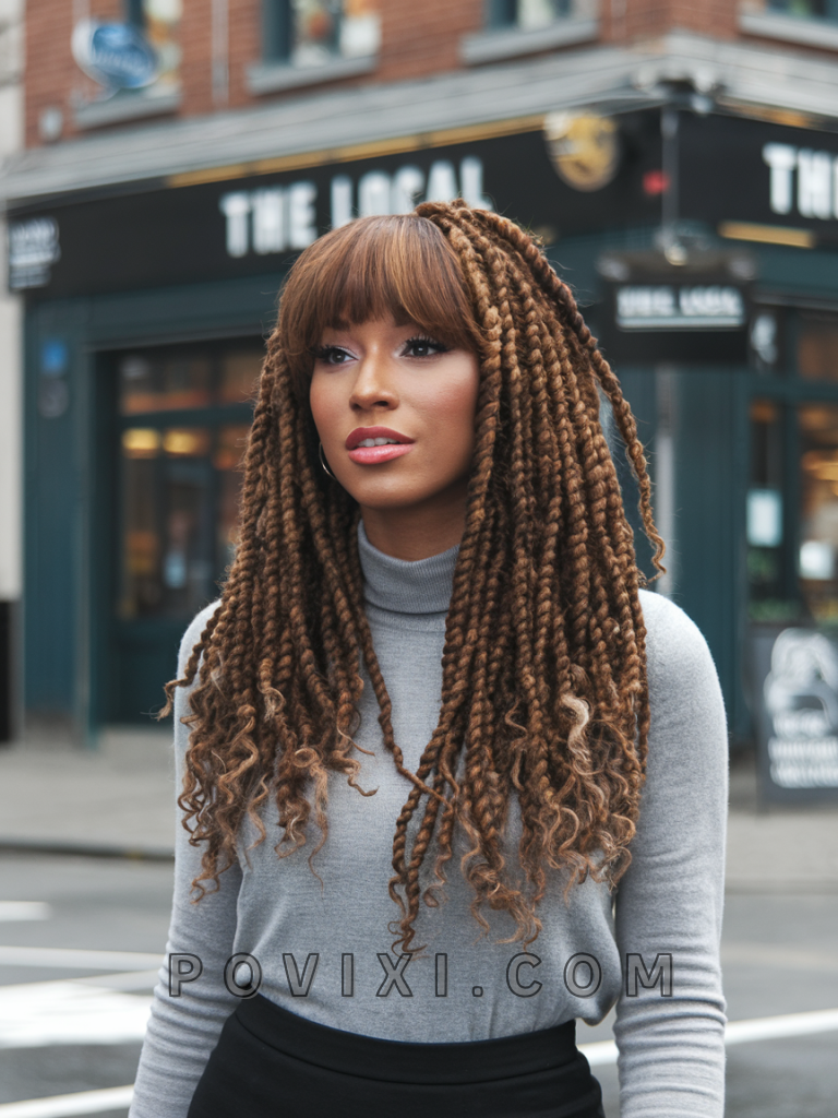 Passion twists with bangs combine edgy and bohemian elements, creating a unique and eye-catching hairstyle. The bangs frame the face beautifully, making this style perfect for heart and diamond-shaped faces. Add soft curls at the ends for an extra playful touch, ideal for casual outings or concerts.