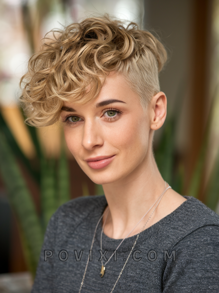 The curly pixie with soft waves is a more delicate take on the traditional pixie cut, ideal for women with a chubby face or round face. The soft waves create movement and texture, making it a great choice for casual outings or even formal events. Hazel or green eyes will especially shine with this style, as the soft waves draw attention to the face.