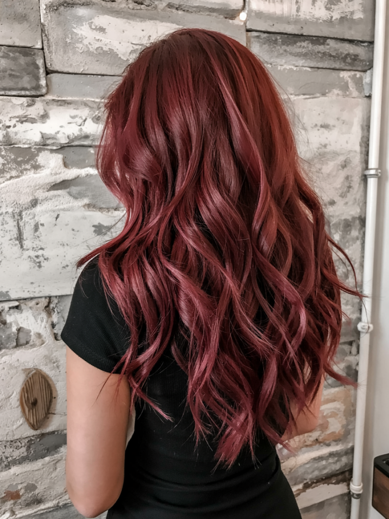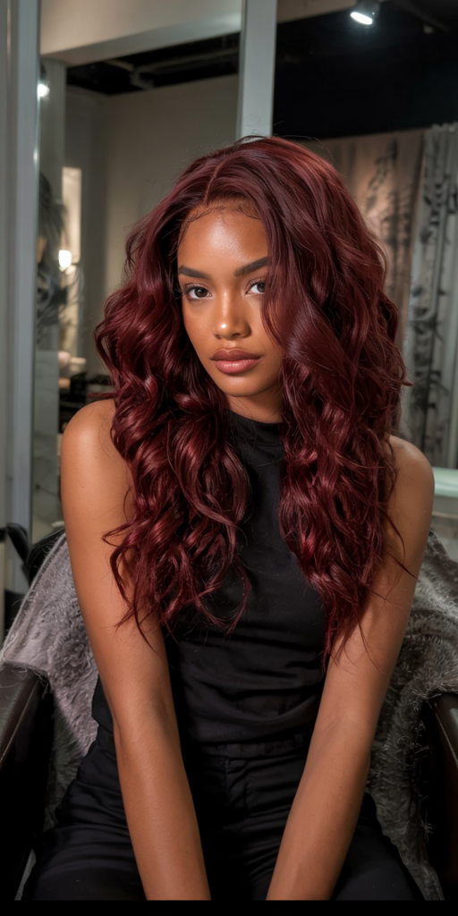 These cranberry-toned waves are the definition of soft glam. There is the bounce, the shine, the richness, it is as though it is always Christmas hair. Having a deep red ground and dimensional accents, it diffuses the light and gives a touch of luxury to any outfits, even casual ones.