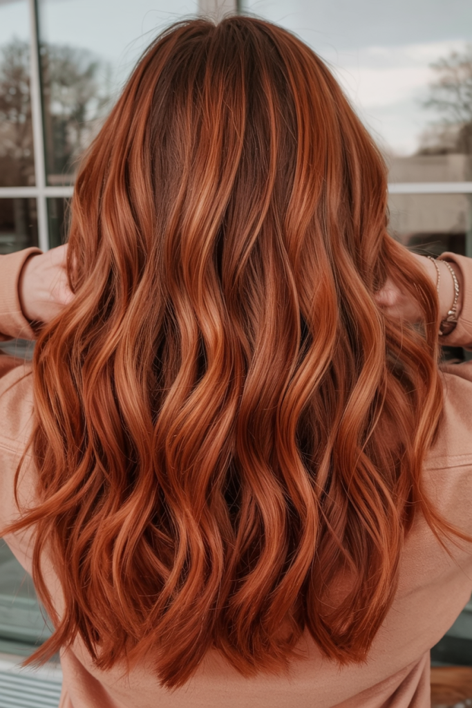 Most suitable with fine to medium hair when it is long, and when given some texture. This style will remain airy and voluminous with a weightless mousse or a texturizing cream. Because the shade blends copper and dark undertones, it’s especially flattering for brunettes who want a bold change without losing depth.