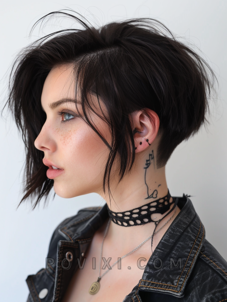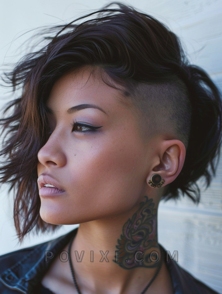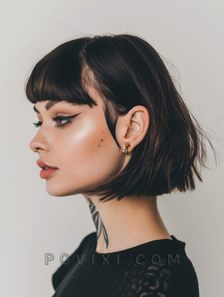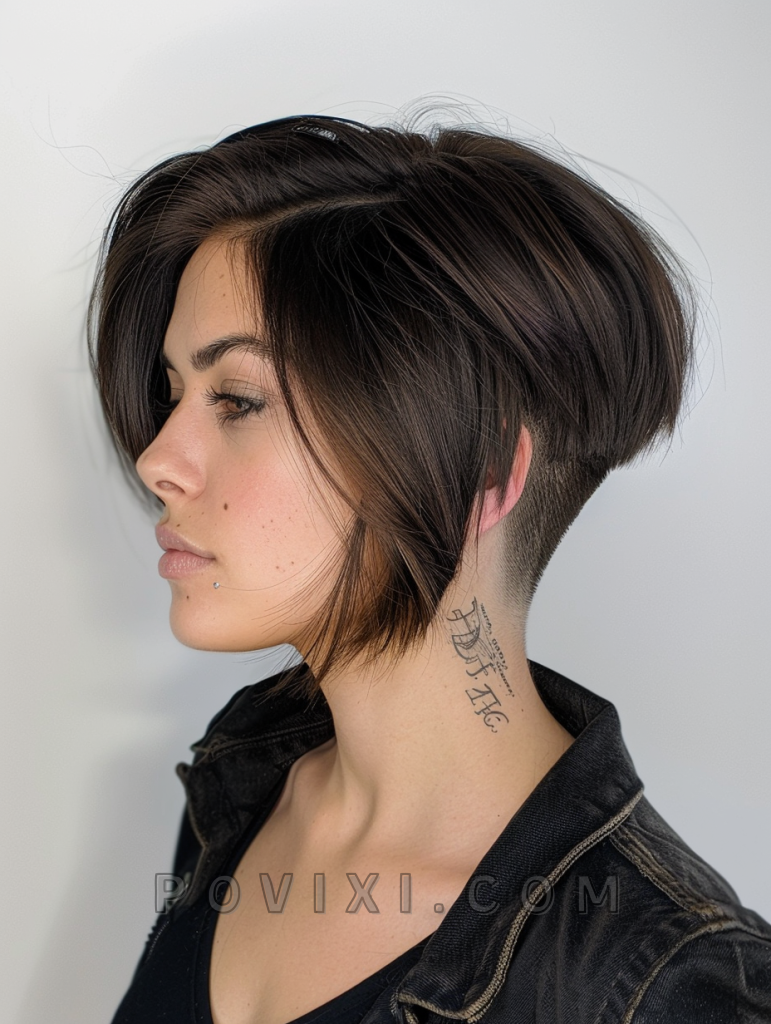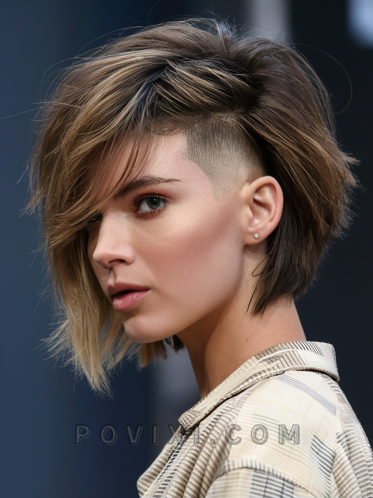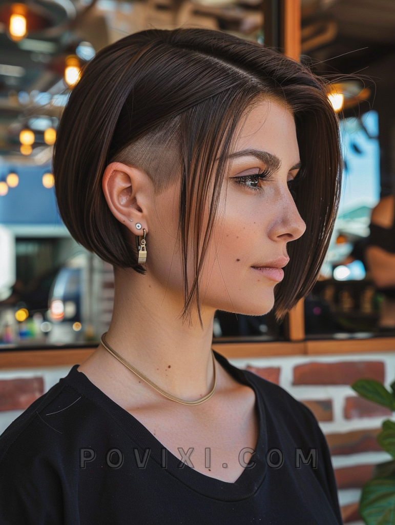 The super sleek bob with side shaved is a bold and ultra-modern style. The sleekness of the bob contrasts sharply with the shaved side, creating a striking and contemporary look. This style is perfect for high-fashion events or a night out. It suits those with straight hair and angular face shapes, emphasizing sharp features and creating a dramatic effect.