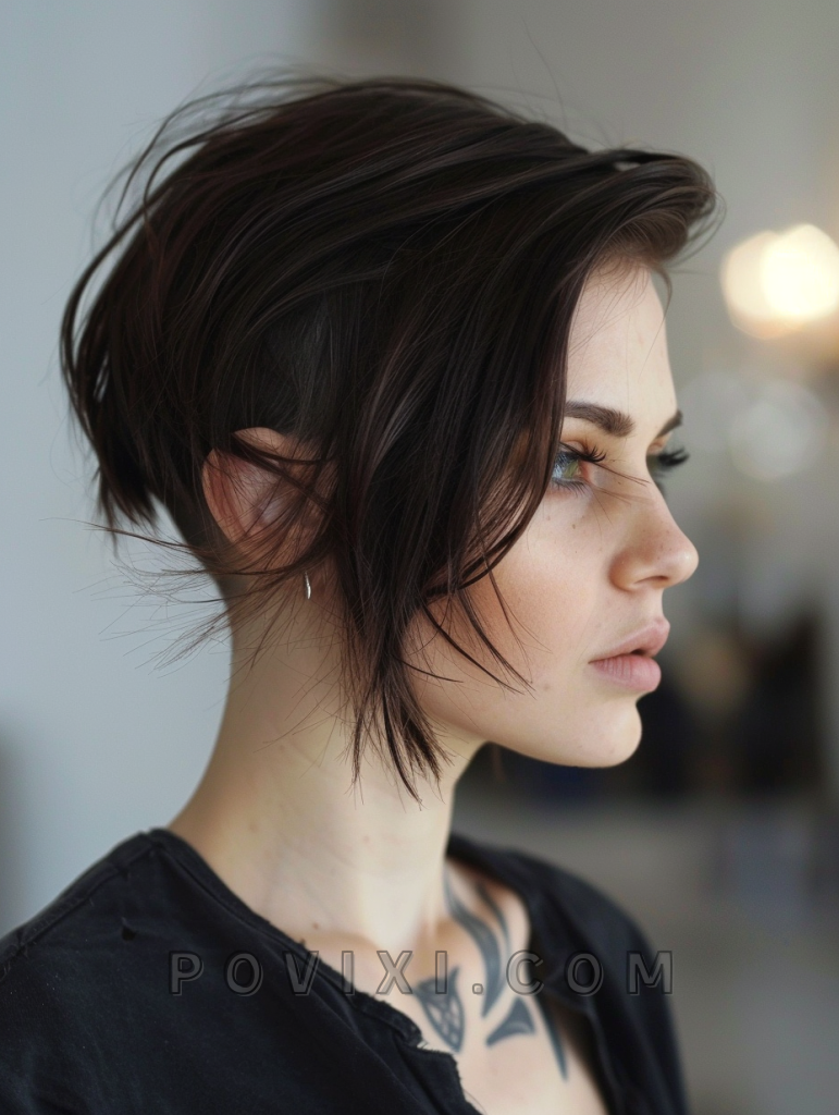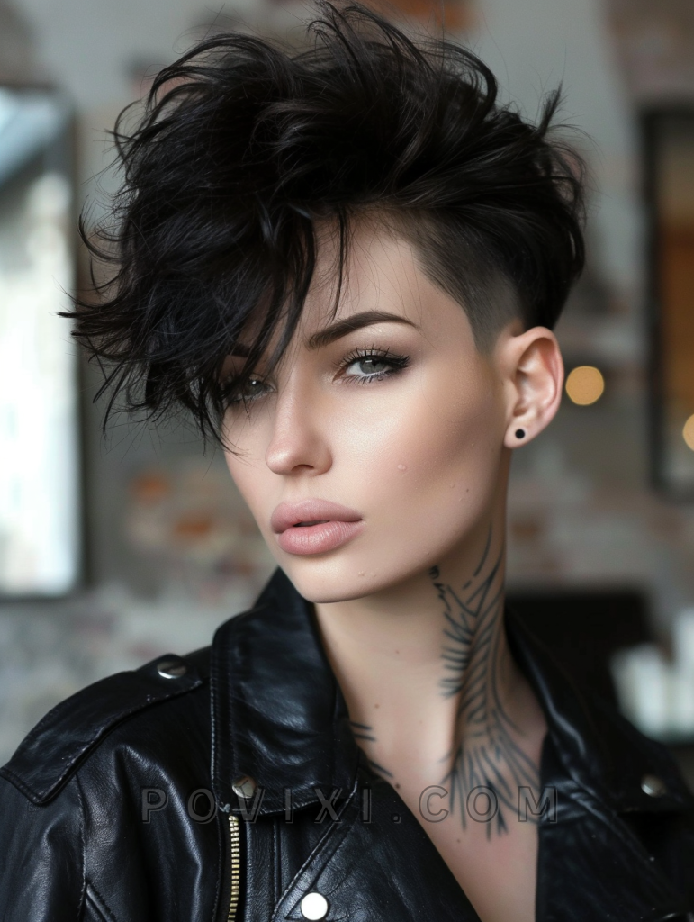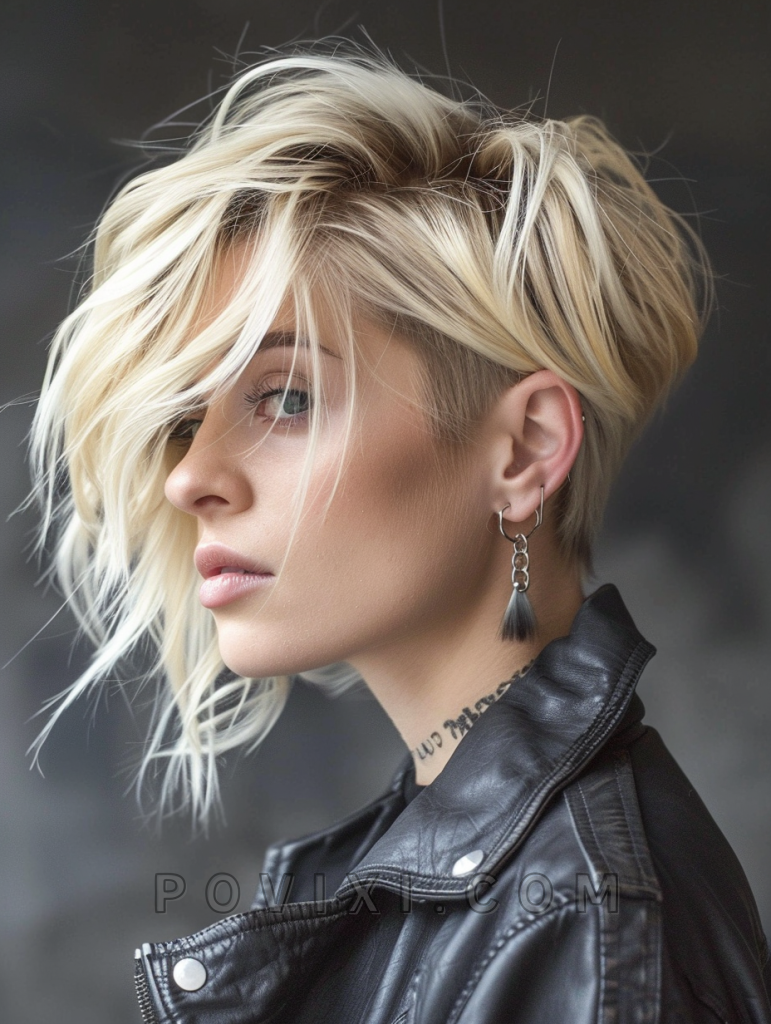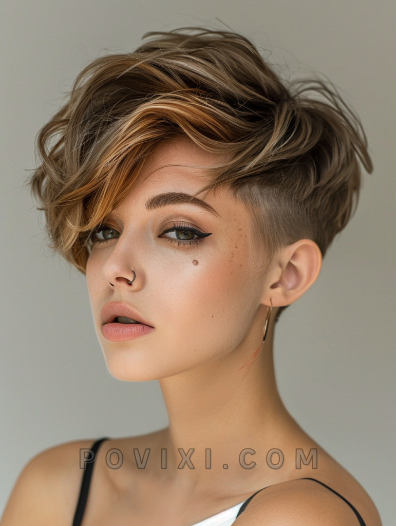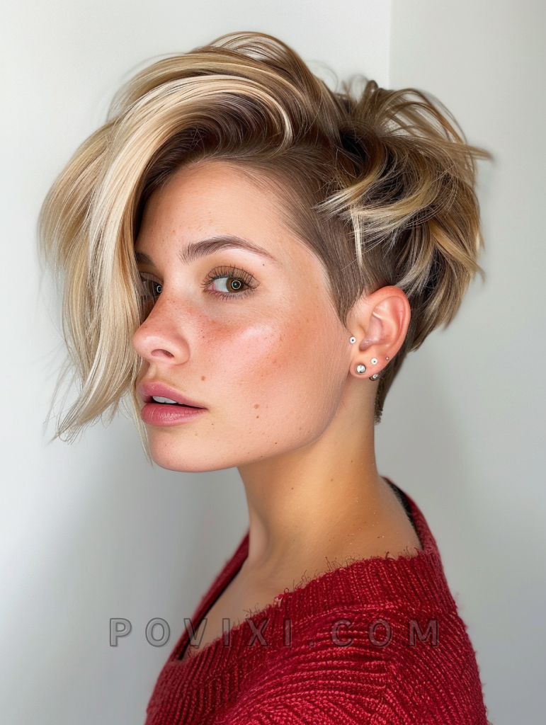 The pixie bob with shaved sides is a chic and edgy hairstyle that combines the length of a bob with the shortness of a pixie cut. This style features very short sides and back with a longer top, creating a modern, stylish look. Ideal for those with round faces and any eye color, this cut works well for both casual and formal events.