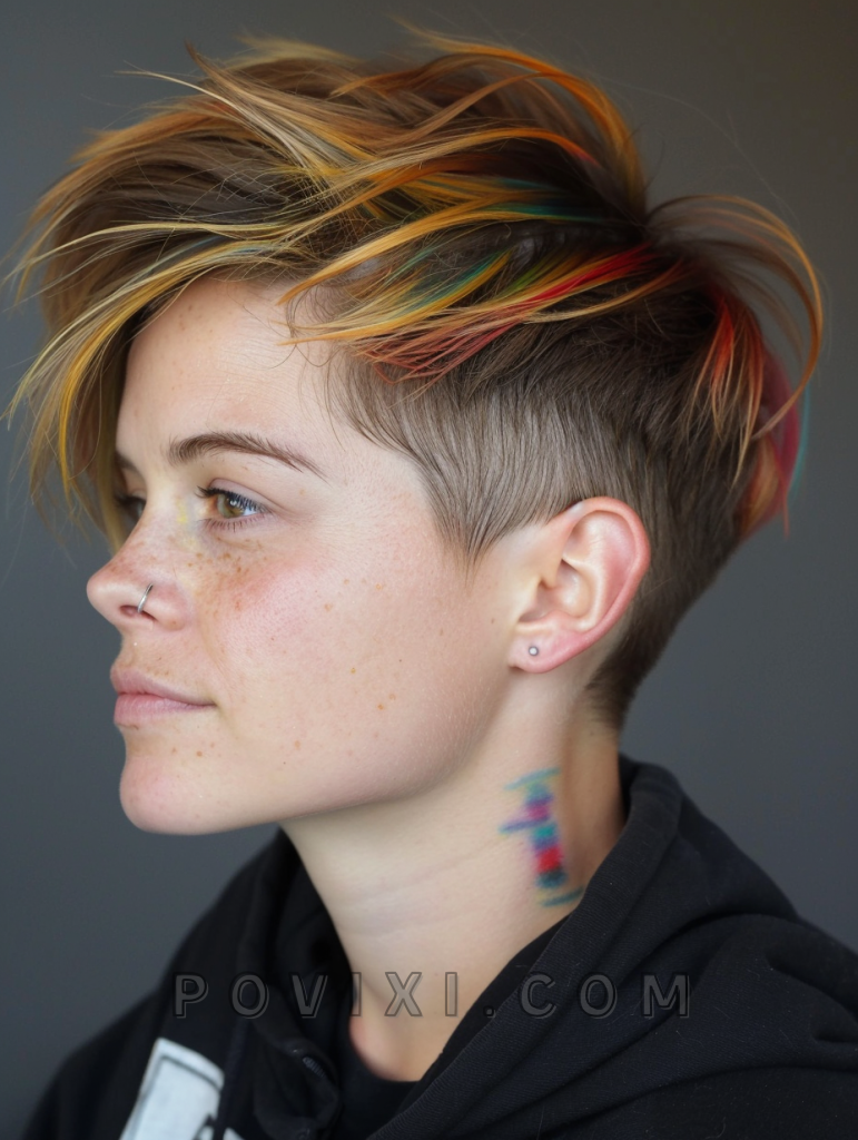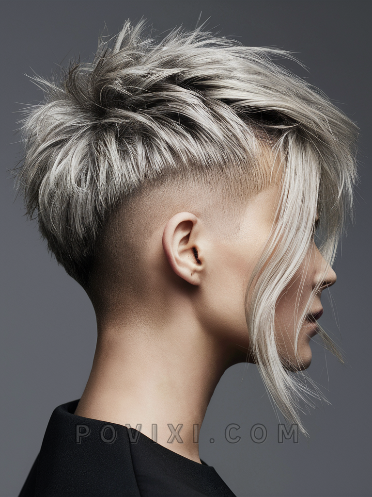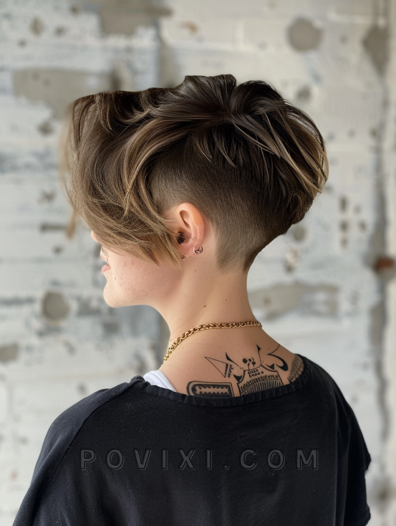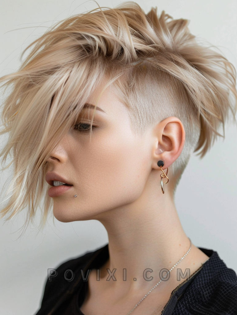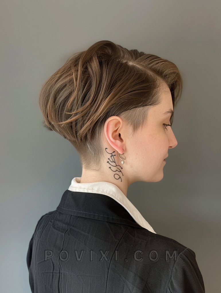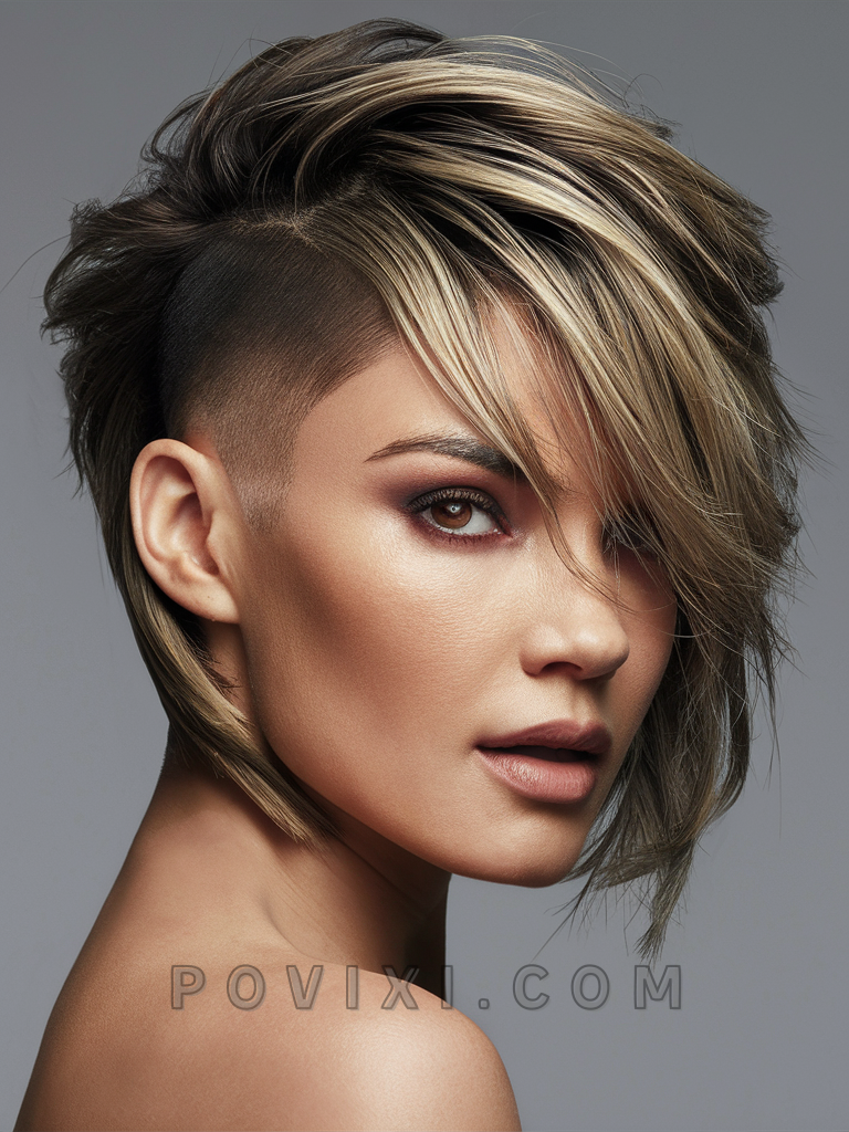 The pixie bob with shaved sides is a chic and edgy hairstyle that combines the length of a bob with the shortness of a pixie cut. This style features very short sides and back with a longer top, creating a modern, stylish look. Ideal for those with round faces and any eye color, this cut works well for both casual and formal events.