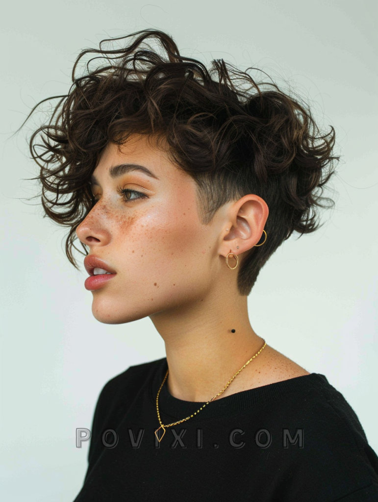 Creating this hairstyle involves using clippers for the undercut and texturizing shears for the feathered layers. To maintain, use a curl-enhancing mousse like OGX Locking + Coconut Curls Air Dry Cream to keep curls bouncy and defined.
