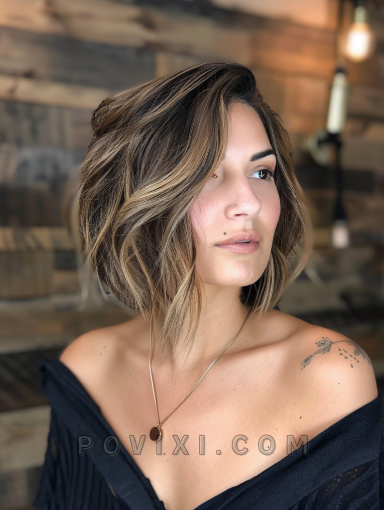 The layered bob with side shaved and highlights is a trendy and dynamic style that combines texture with color. The layers add volume and movement, while the side shave and highlights provide an edgy and modern twist. This style is perfect for those with wavy hair and suits heart-shaped faces. It’s great for both casual and professional settings.