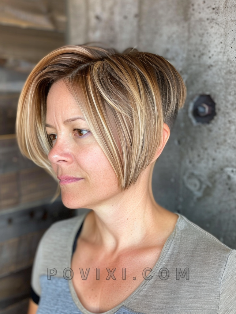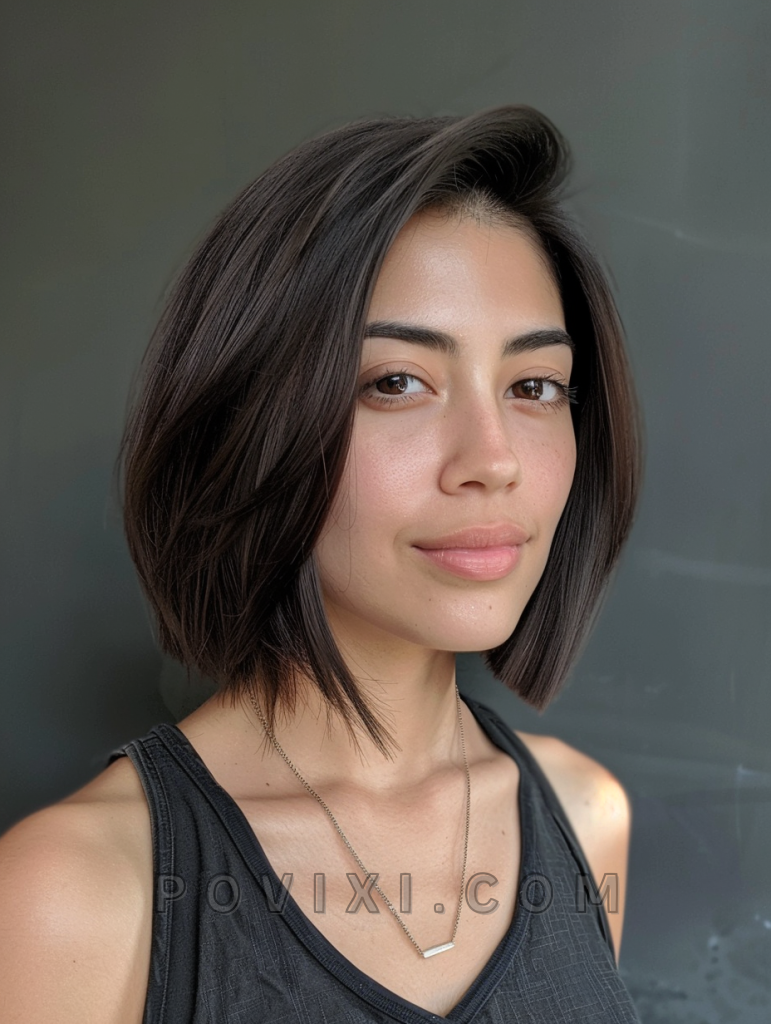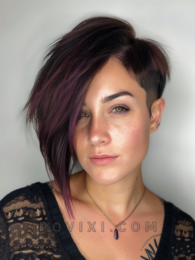 The asymmetrical bob with shaved sides is a daring choice that balances elegance and edge. This style features one side of the bob longer than the other, creating a dynamic and modern look. It’s perfect for round faces, as the asymmetry elongates the face and adds a slimming effect. Ideal for fashion-forward events or casual outings, this hairstyle suits all eye colors but particularly complements bold makeup looks.