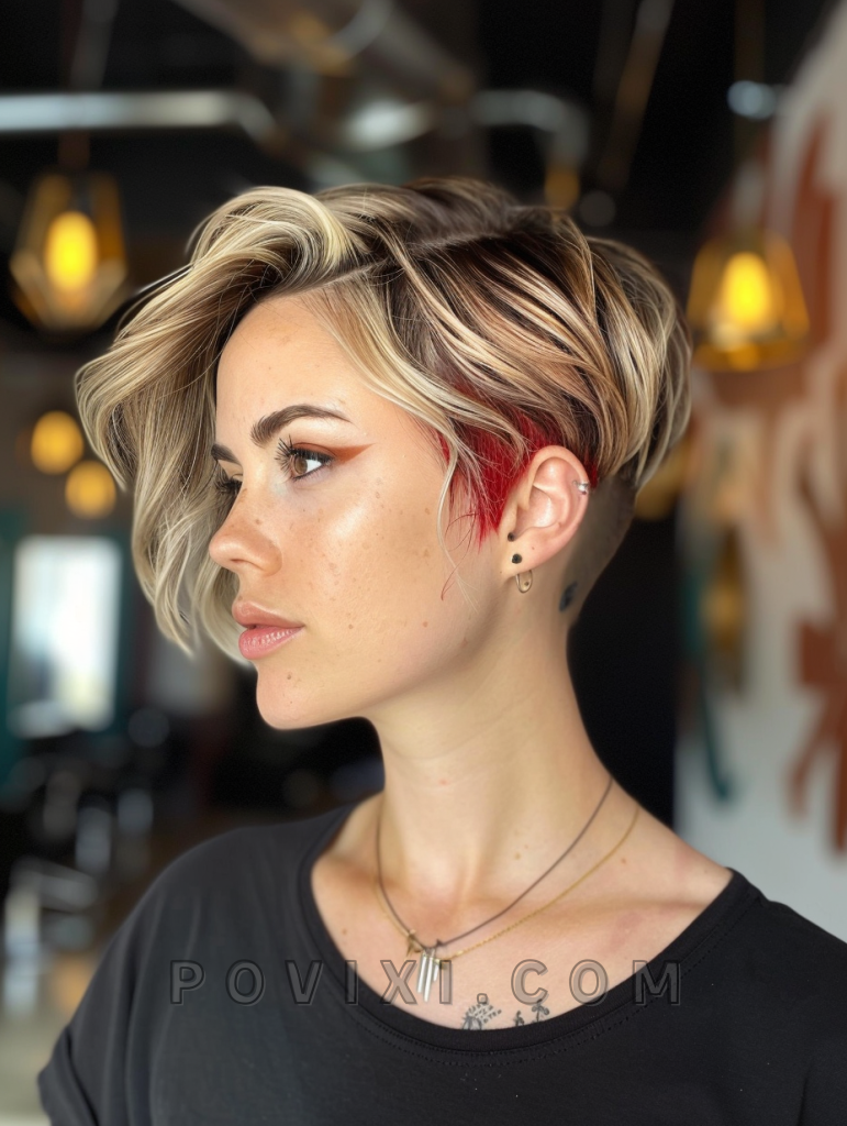 The pixie bob with dual tone and undercut is a bold and vibrant style that combines short layers with a contrasting color. The undercut adds an edgy element, while the dual tones create a striking visual effect. This style is perfect for those with straight hair and suits oval and heart-shaped faces. Ideal for fashion-forward events or making a statement at parties.