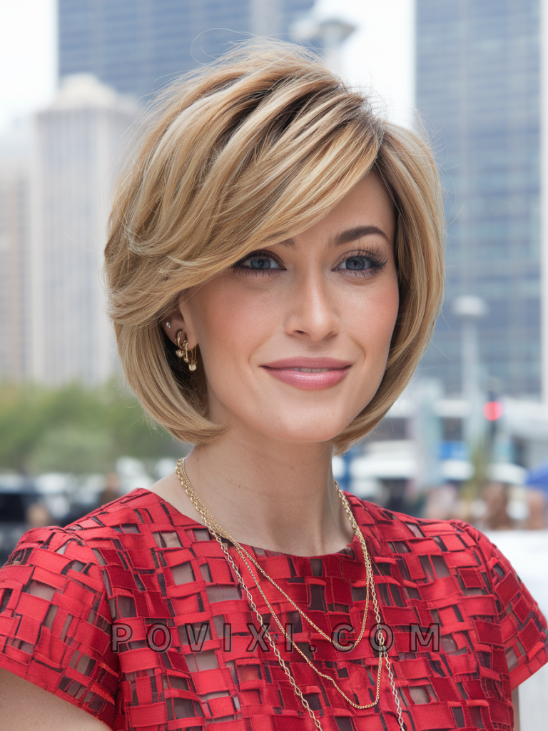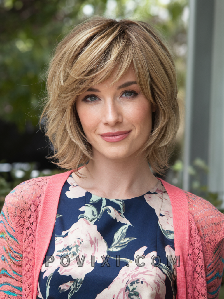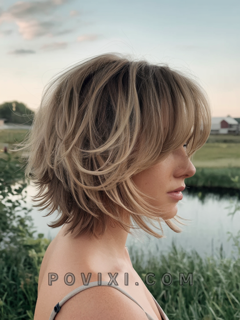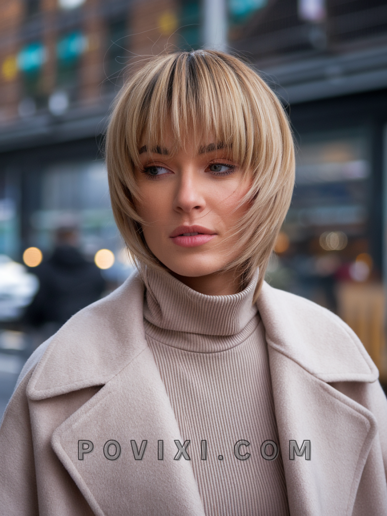The blonde layered bob with side bangs combines classic elegance with a fresh, modern vibe. This style is perfect for fine hair, as the layers add volume, and it pairs beautifully with blonde tones. It’s great for formal events, casual gatherings, or even a first date.