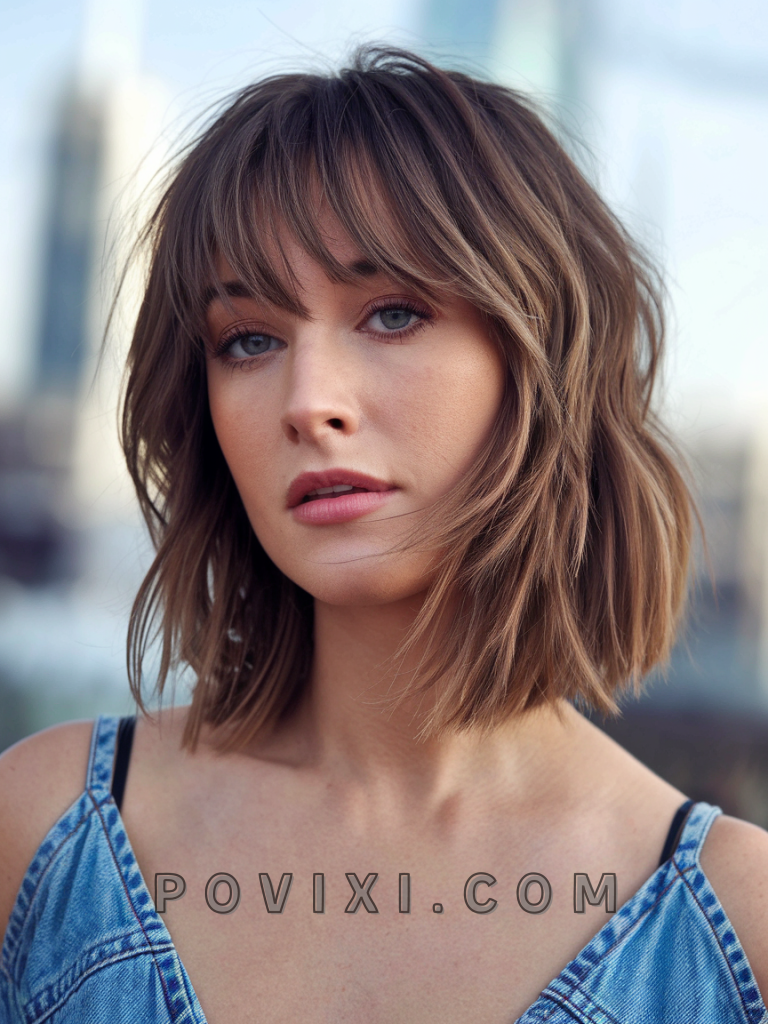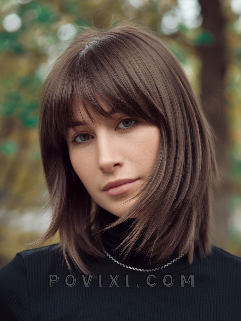 Shoulder length curtain bangs layers offer a timeless appeal that combines elegance and modern trends. This haircut frames the face beautifully, making it ideal for round faces and individuals with medium hair. It’s equally stunning on both wavy hair and straight hair, lending a soft, romantic look suitable for weddings or date nights.