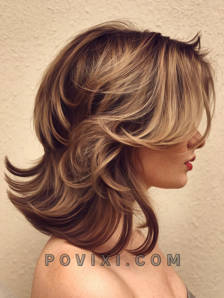 The soft layers with feathered ends offer a romantic and feminine touch to medium length hair. This style flatters round faces and complements soft features, making it a popular choice for weddings, date nights, or elegant parties.