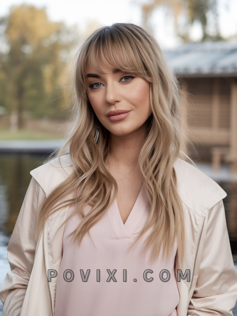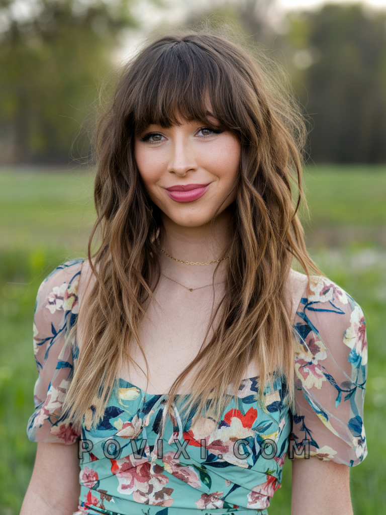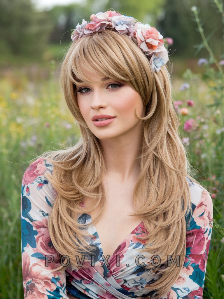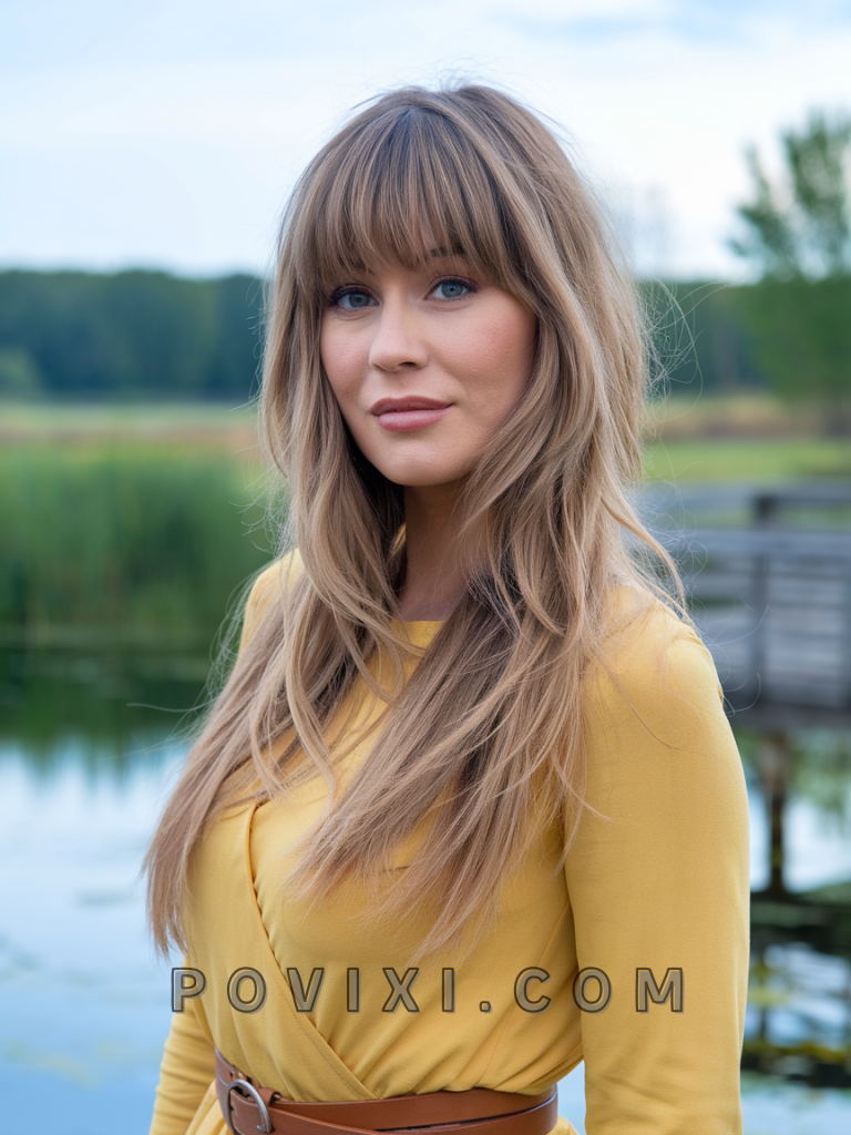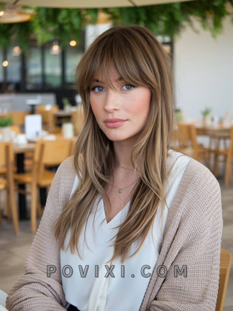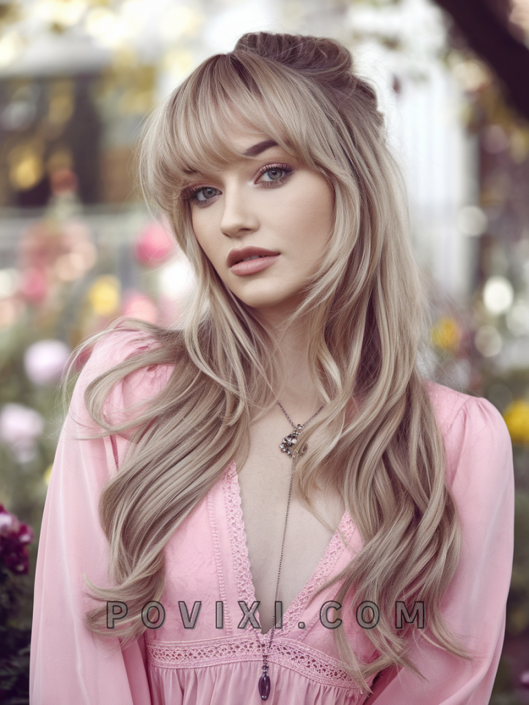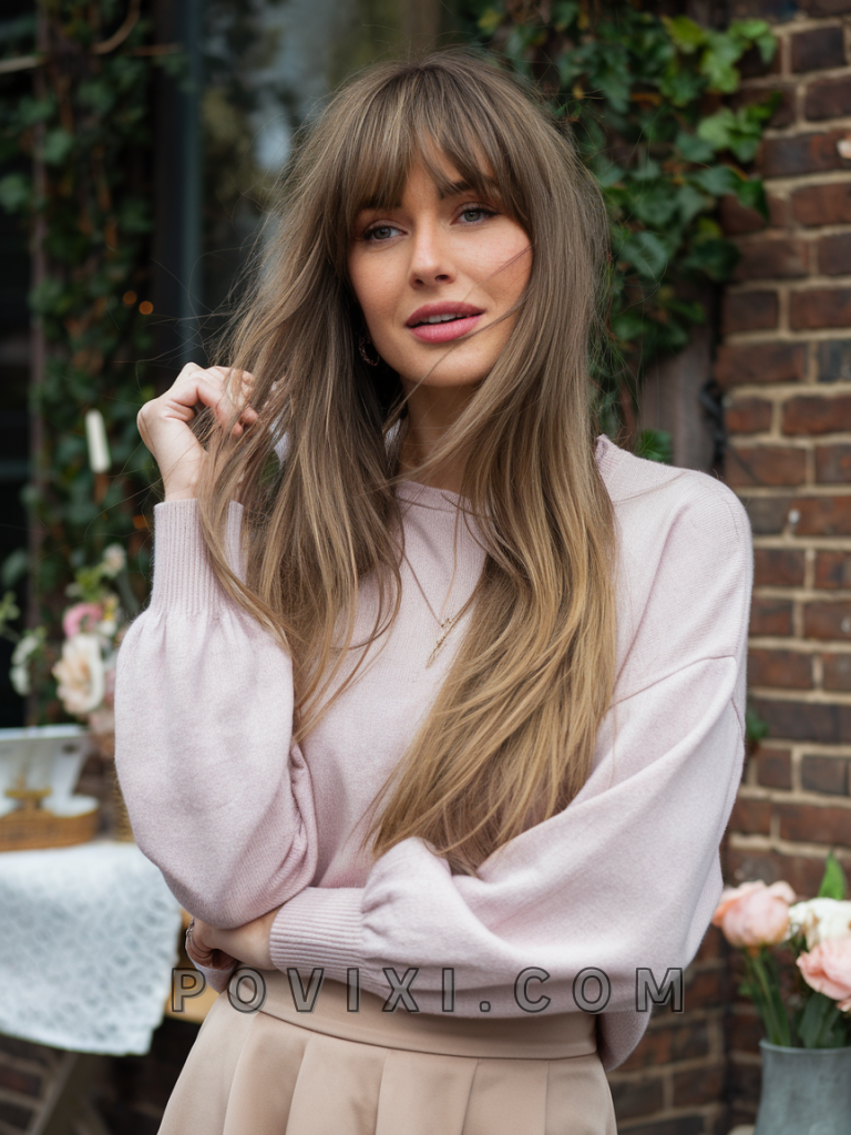 The soft bangs cascade on either side, enhancing your cheekbones and drawing attention to your eyes, especially if they are hazel or green. This look is versatile and suits casual brunches or romantic spring evenings.