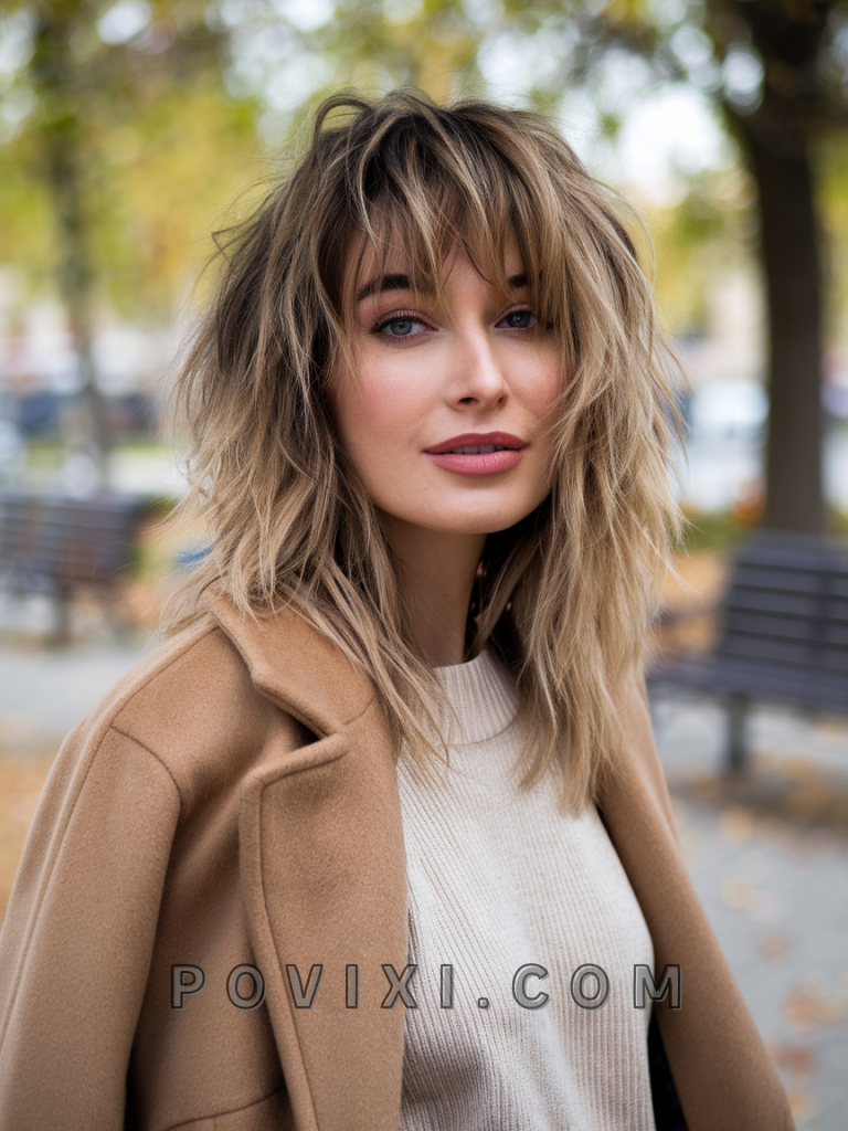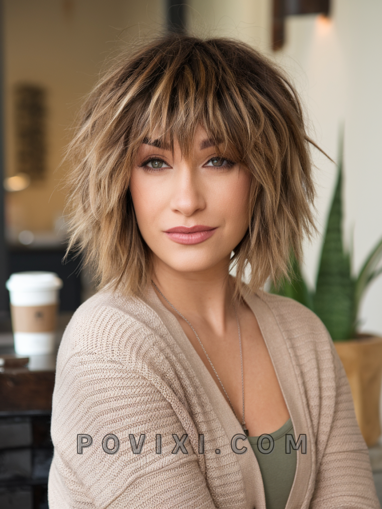 The textured shag with wispy bangs is a playful, modern take on the classic shag haircut. It’s ideal for creating movement and volume, making it perfect for a casual coffee date or a day at the park. This cut works best for square or rectangular face shapes and looks stunning with deep brown or balayage highlights, especially on brunettes.