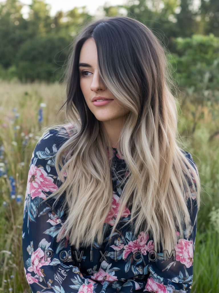 Long layers combined with peekaboo balayage offer a fun and playful twist to your hairstyle. This style suits most face shapes and adds depth to dark brunette hair. It’s perfect for those who want a subtle yet trendy look for spring festivals or casual hangouts.