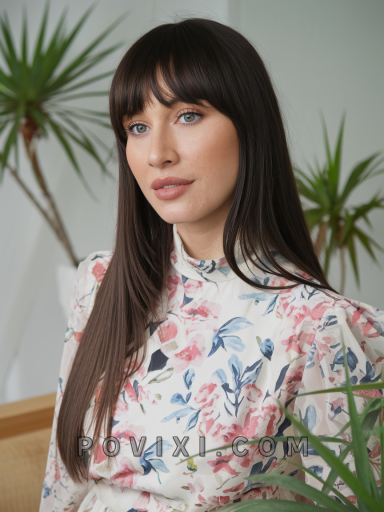 A sleek straight cut paired with bold bangs offers a minimalist yet sophisticated look. This style suits square and oval faces, emphasizing symmetry while drawing attention to your eyes. It’s especially striking with rich brunette shades or subtle balayage for brunettes.