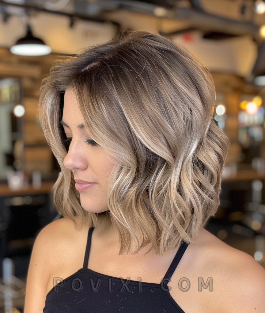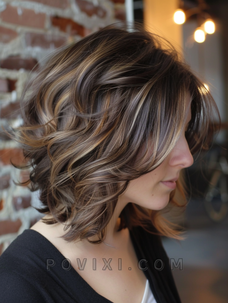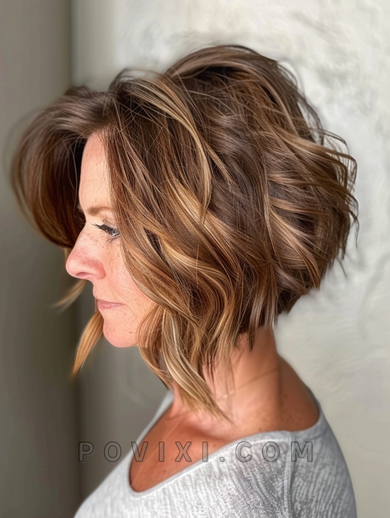 The wavy stacked bob is a relaxed and stylish option that incorporates natural waves into the classic bob cut. This look is ideal for those with naturally wavy or curly hair, as well as those who want to add some texture to their straight hair. It’s suitable for all face shapes and adds a touch of effortless elegance.