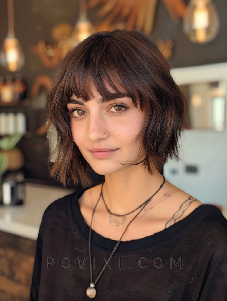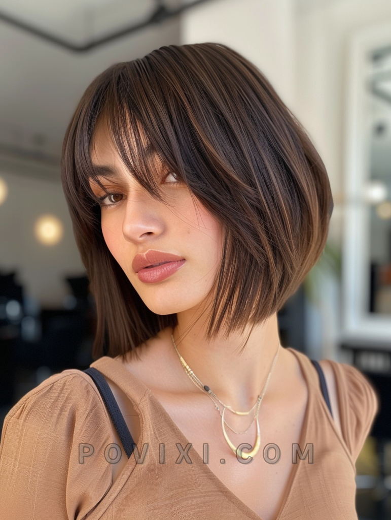 Adding bangs to your stacked bob can completely transform your look. This style combines the classic stacked bob cut with either blunt or side-swept bangs. It’s a great way to frame the face and highlight your features. This hairstyle works well for those with oval, heart, and round face shapes and can complement any eye color.