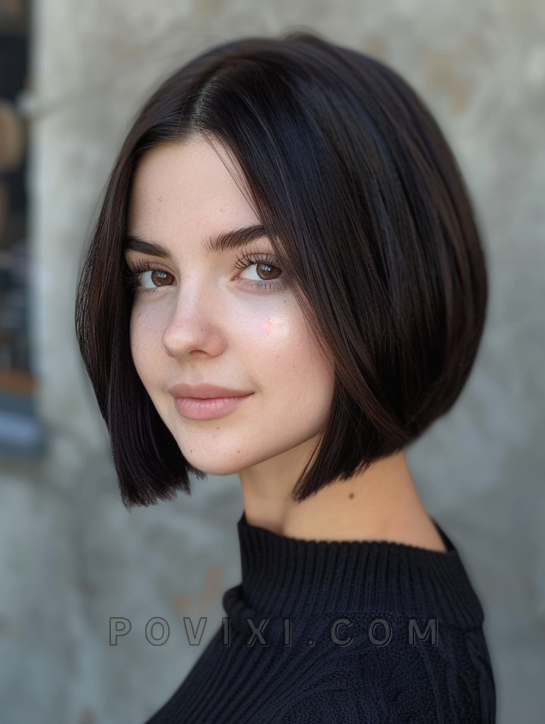 The blunt stacked bob is a bold and striking style that features sharp, even ends without any layers. This look is perfect for those who want a clean and modern appearance.  It works best for those with straight or slightly wavy hair and suits all face shapes, especially oval and square.