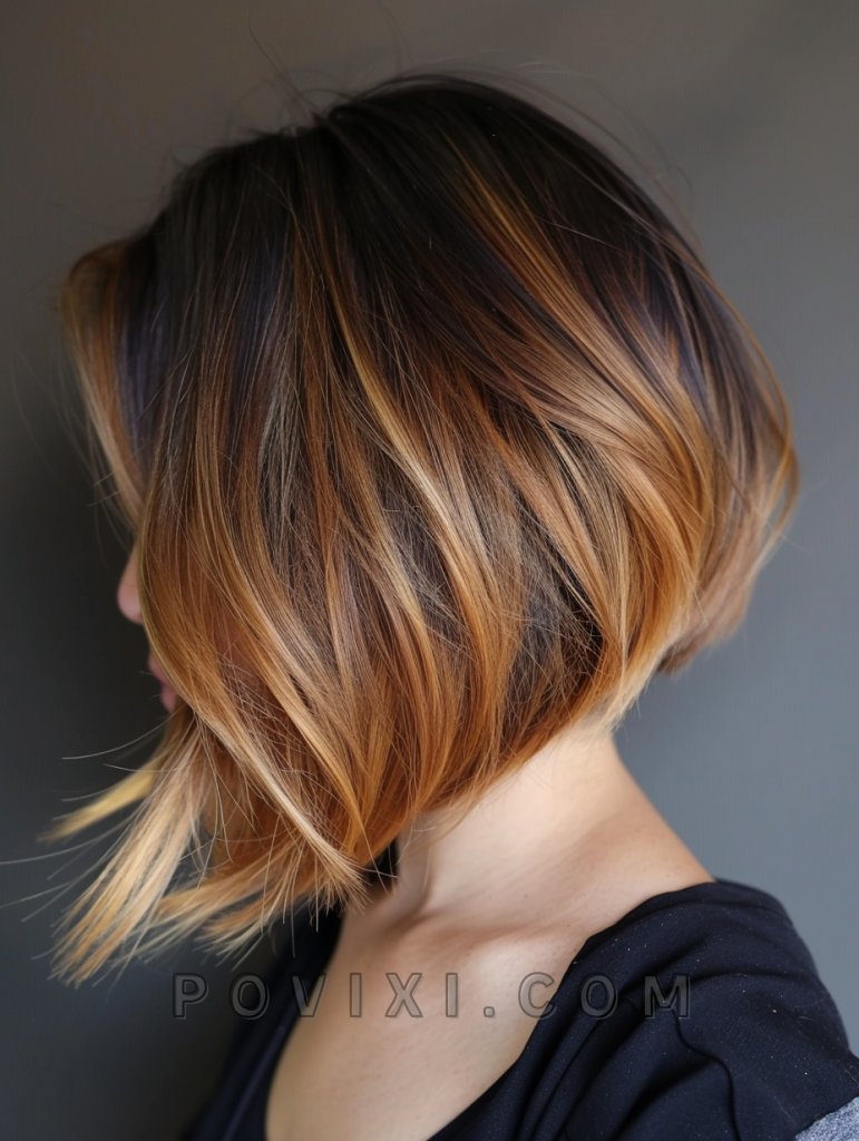 An ombre color transition can add a beautiful gradient effect to a stacked bob. This style is ideal for those who want a low-maintenance color option that still looks stunning. The ombre effect works well with all hair types and face shapes, adding depth and dimension to the hairstyle.