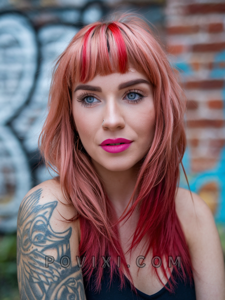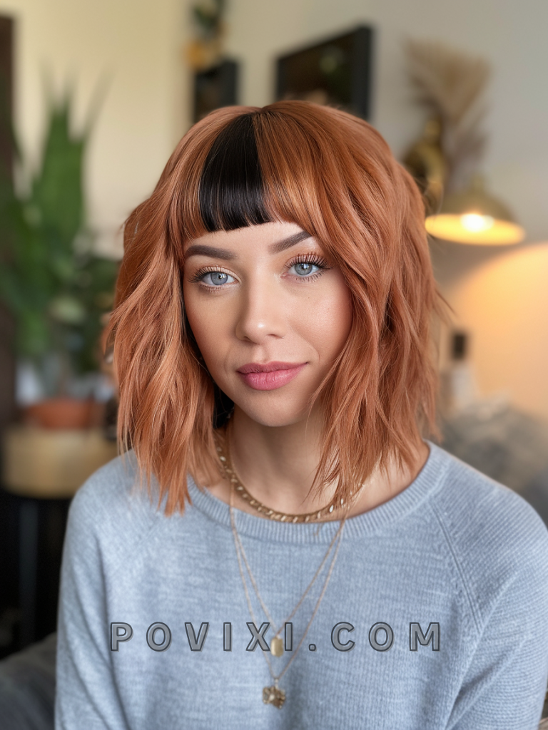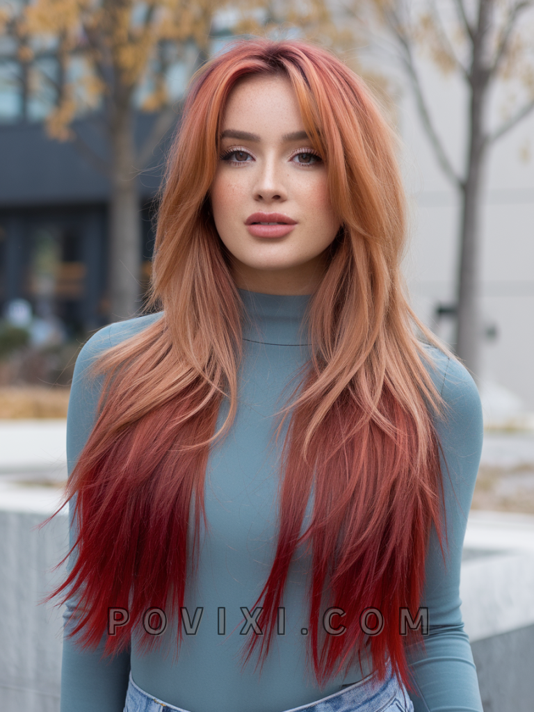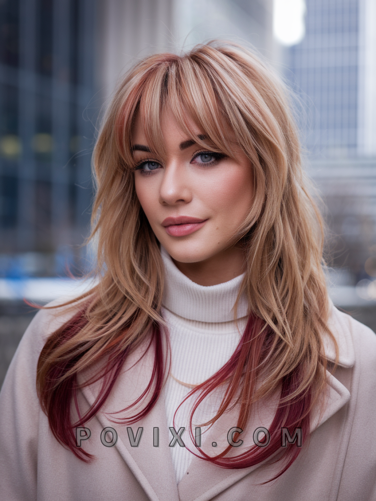 This bold style incorporates peekaboo highlights in honey and red shades, offering a playful twist. The contrast between the dark roots and vibrant streaks creates a dynamic look, ideal for festive events or music festivals. This hairstyle suits heart-shaped and square faces, emphasizing striking features like high cheekbones.